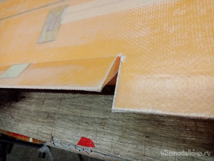 Самая сложная операция. Отрезка элерона. Закрепляю металлическую линейку и прорезаю верхний слой стеклоткани и немного в глубину ядра. Шкуркой немного затуплю кончик ножа и втыкаю его на максимум в пенопласт. Уперся в нижнюю стенку. Не сильно нажимая прорезаю весь элерон до конца. Главное не прорезать слой смолы с капроном. Справился. Вся спина мокрая. Одно неверное движение.. и так восемь раз. Осторожно отгибаю элерон. Прядок. Резал точно, ничего не повредил.