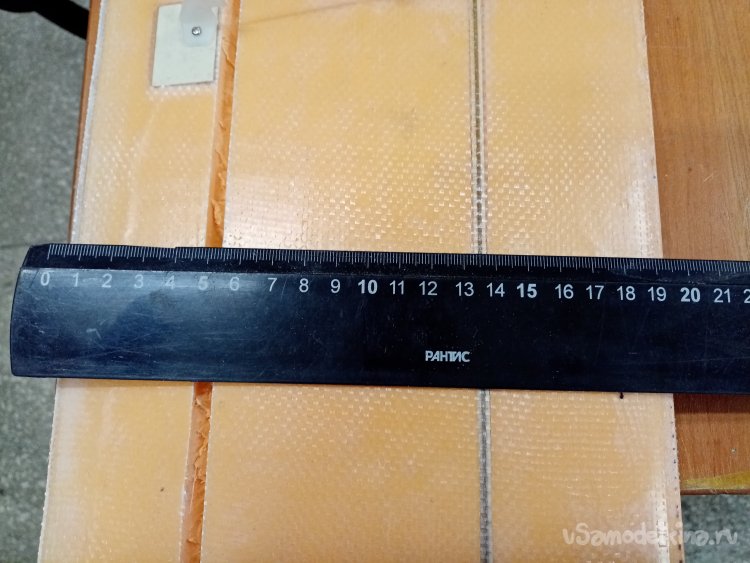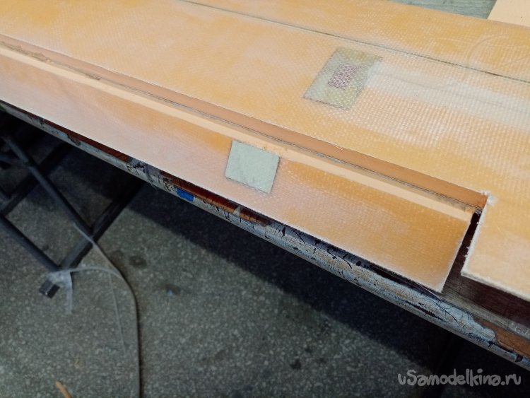 И тут допустил простую ошибку. Резал далеко по пенопласту. Нужно было по стеклоткани. Тогда контур будет замкнут. Куда смотрел. Не знаю. И так четыре раза. В этом месте при нагрузке обшивка может отслоиться от ядра.