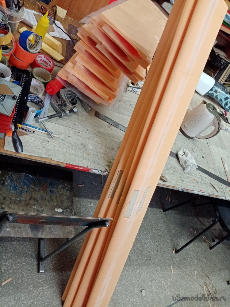 Для прижатия обшивки к ядру крыла собираю из половинок два стапеля. Верхнюю и нижнюю половинки, торцую на самодельном приспособлении. Склеиваю. Затем место стыка шлифую. По бокам приклеиваю планки при помощи термопистолета. Для прочности.
