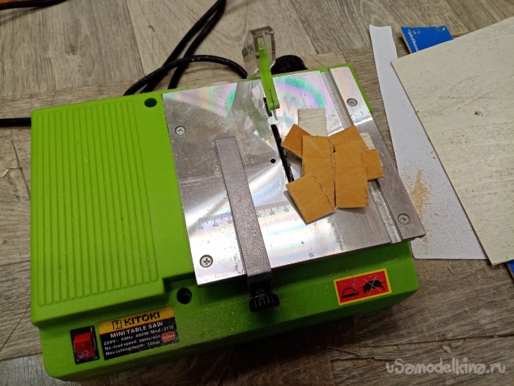На нижнюю поверхность нужно наклеить контрастные полосы. Для лучшего визуального контроля модели. Главное хорошо устроить рабочее место. На вертикальном резательном станке вырезаю подставки. Работать со скотчем удобно.