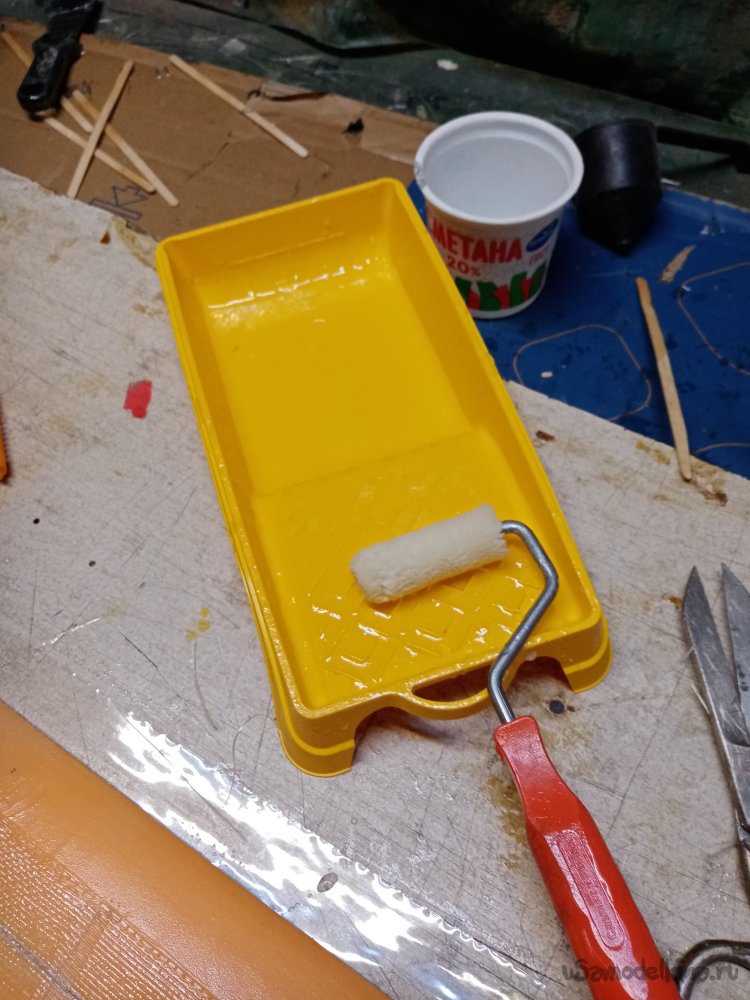 В работе по плоскости применяю небольшие валики. С ворсом под лак. Первая операция, замешиваю сто грамм и наношу смолу на переднюю кромку крыла, затем укладываю неширокую полоску и загибаю концы на верхнюю сторону и нижнюю. Вожусь долго, поскольку ткань не пропитывается мгновенно. Затем полоски капрона в район сгибания элеронов, пропитываю смолой. Нужно подождать. Наконец все пропиталось и прилипло. 50 грамм кончились. Замешиваю сто грамм. Поскольку как раз хватает раскатать по верхней стороне крыла, уложить стеклоткань и прокатать поверх. Раскатываю смолу по верхней стороне, в среднюю часть укладываю кусочек усиления, пропитываю его и укладываю основное полотно. Справился. Одна сторона готова.