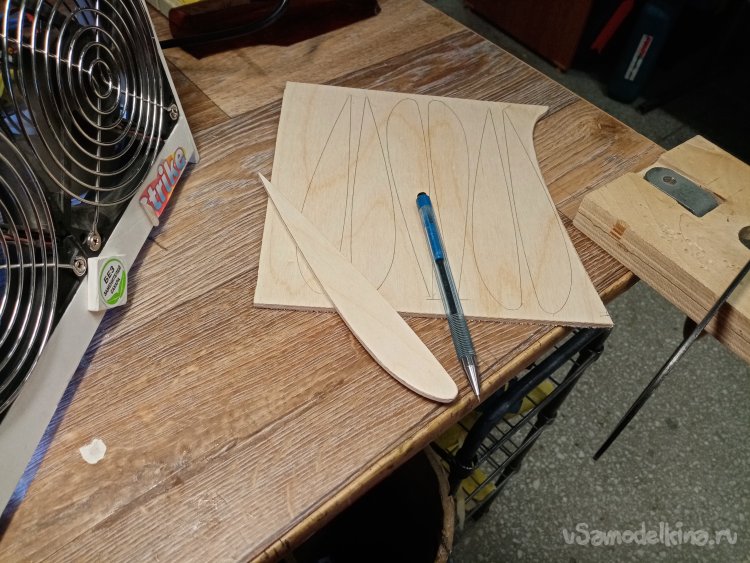 Расчерчиваю на 4 мм шлифованной фанере заготовки торцов крыла. Выпиливаю и закрепляю термопистолетом.