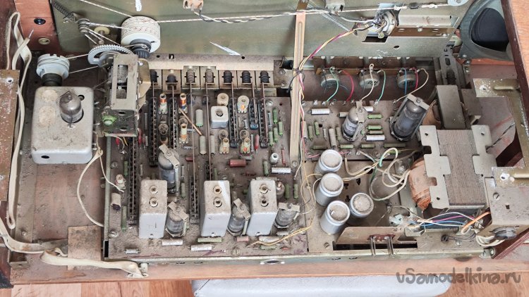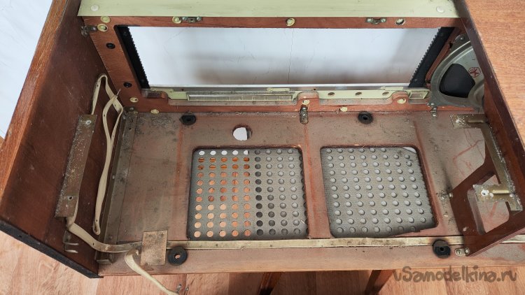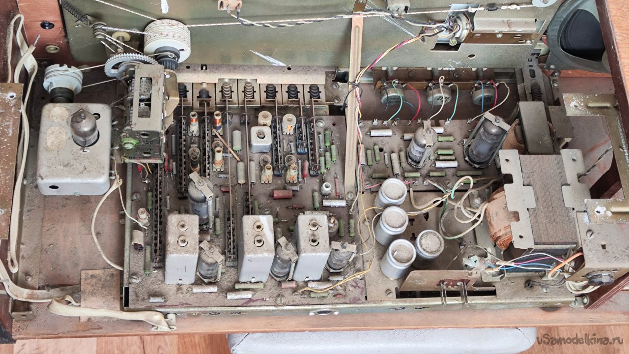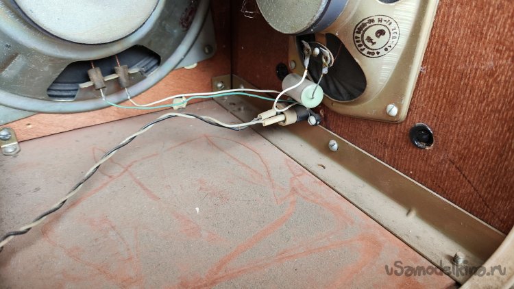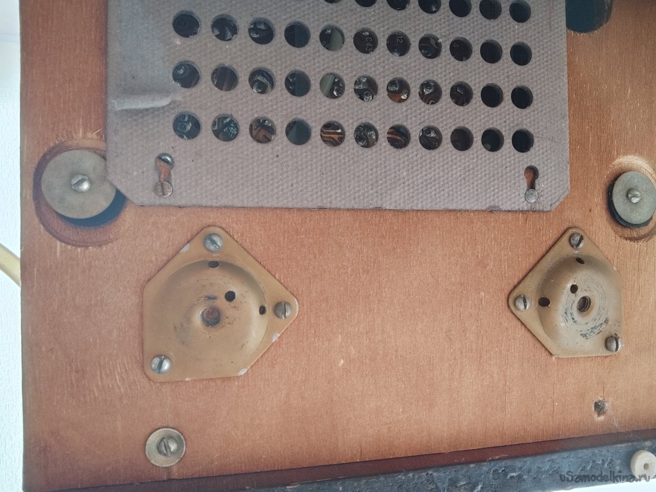 Очевидное достоинство радиолы это разъемы. Панель проигрывателя на разъемах, встроенные динамики тоже на разъеме. Радиолампы само собой на разъемах - ламповых панельках.