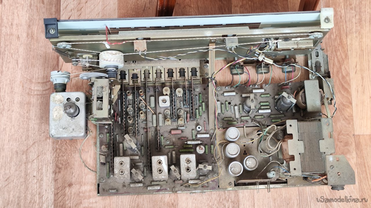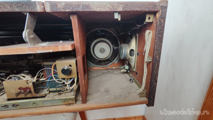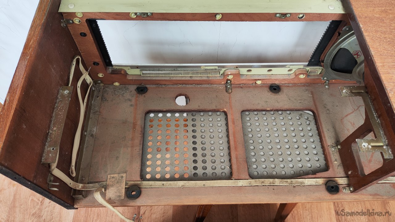 Внутри живет своей жизнью приличный слой пыли. Радиолу скорее всего разбирали, по крайней мере снимали задний экран, пломб не было.