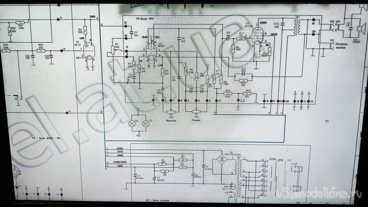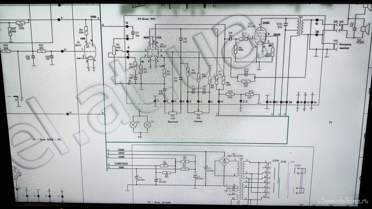 Припаял на выход старый автомобильный динамик. Первое включение. Лампы медленно нагреваются и ничего, тишина. Решил проверить напряжение на конденсаторах фильтра питания. Оно есть только на одном конденсаторе С4, который на 450 вольт. На остальных ноль. Поискал распечатанную четыре года назад схему, что-то не нашел. Но схема есть на компьютере. Включаю компьютер, смотрю схему питания.