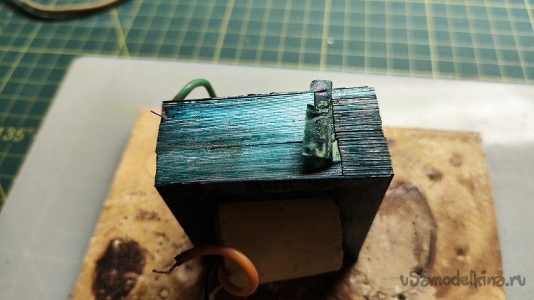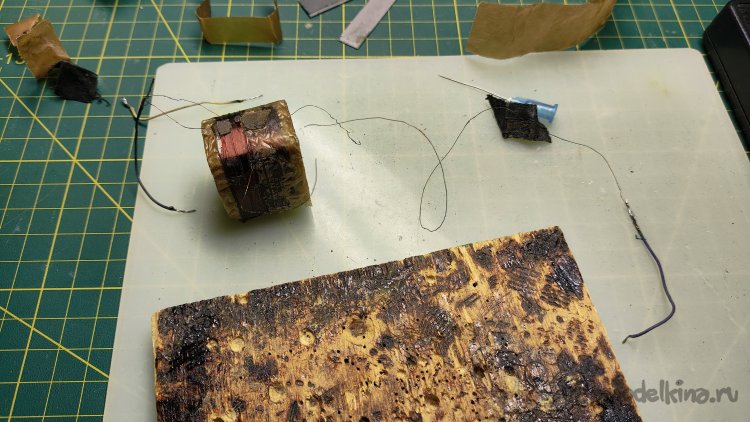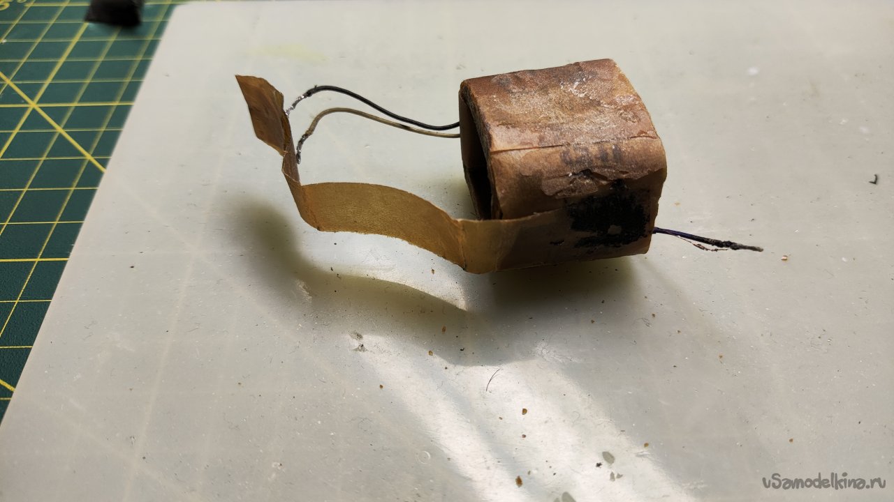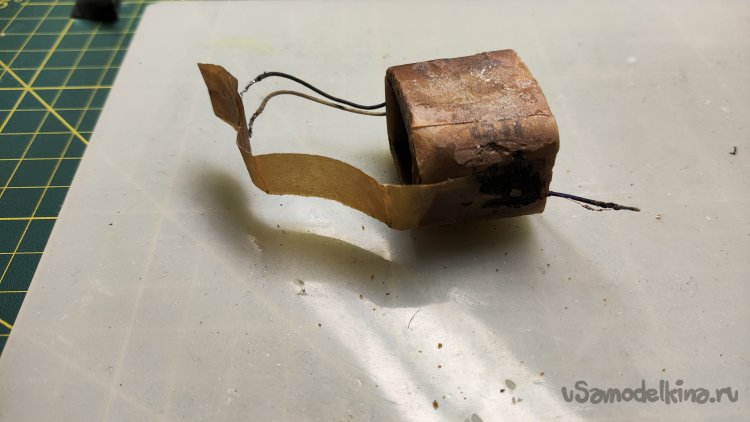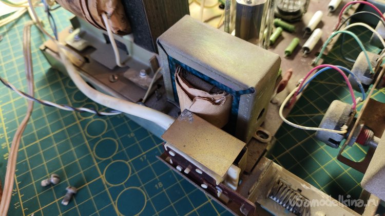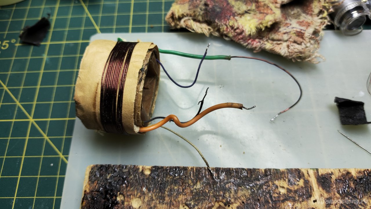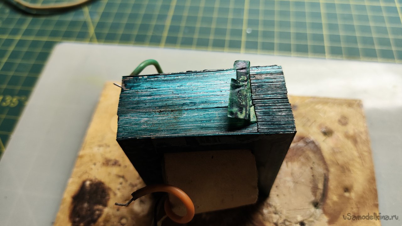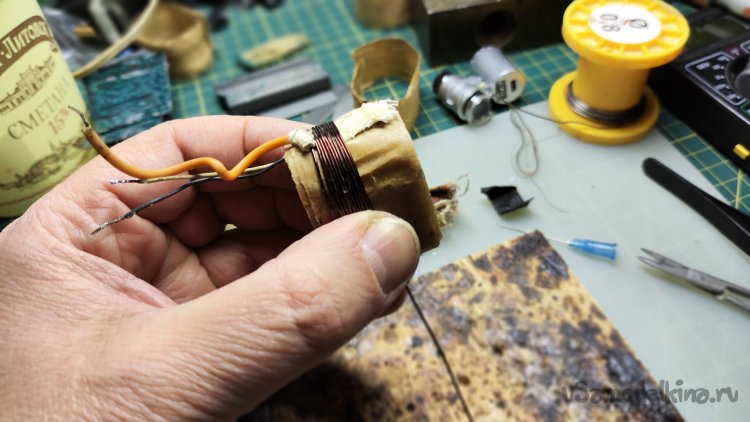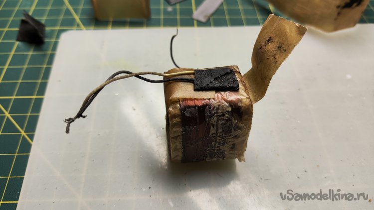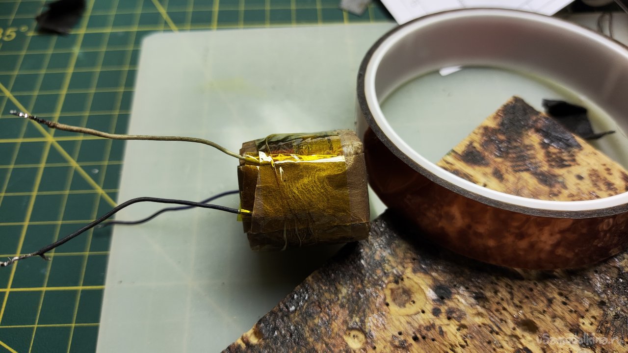 Внимательно осмотрел обмотку, точка повреждения немного дальше, поэтому отмотал еще несколько витков. Залудил провод обмотки, прозвонил. Целая! Можно собирать трансформатор. Припаял провода выводов, изолировал провода и зафиксировал обмотку каптоновым скотчем. Немного новых технологий в раритет!