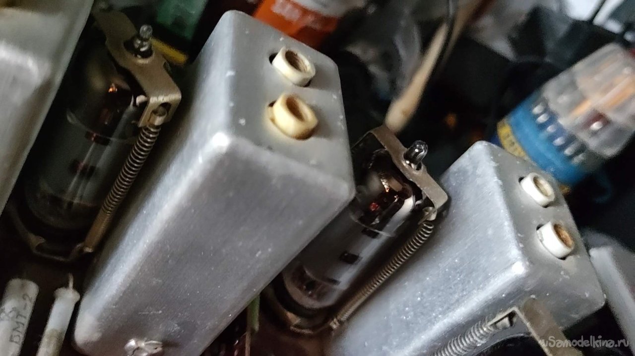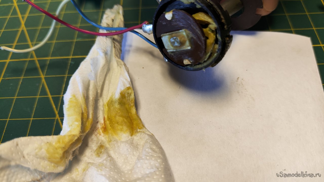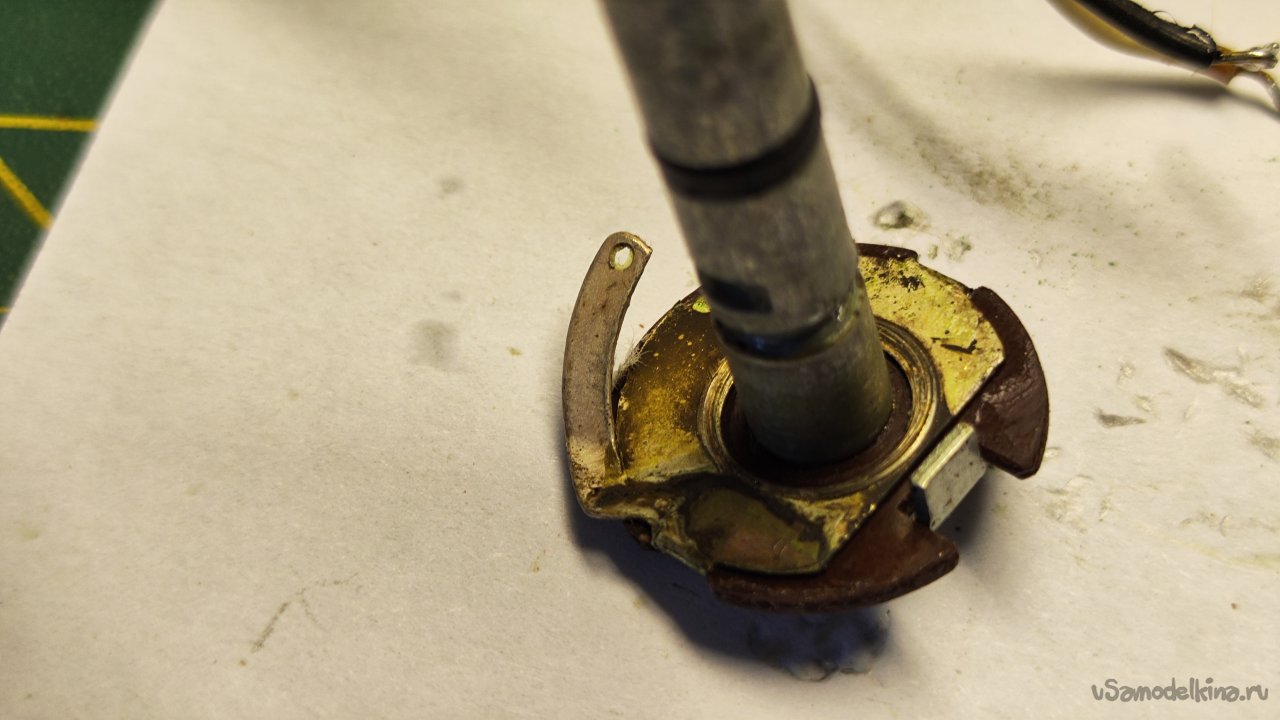А пока лампа едет можно заняться чисткой контактов переключателей. Серебряное напыление на них все черное. Снимаю фиксаторы.