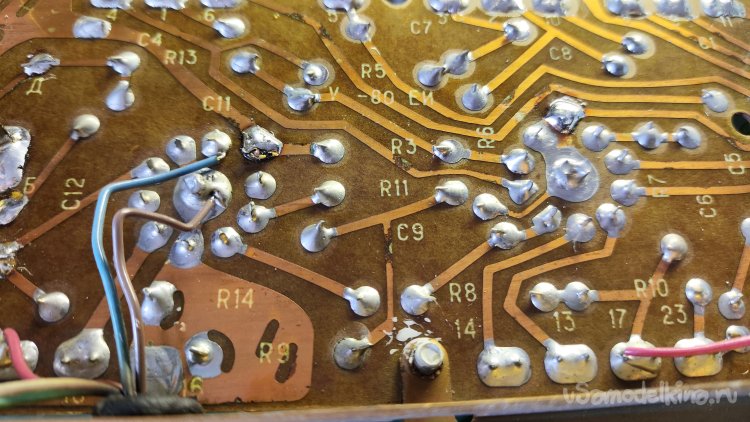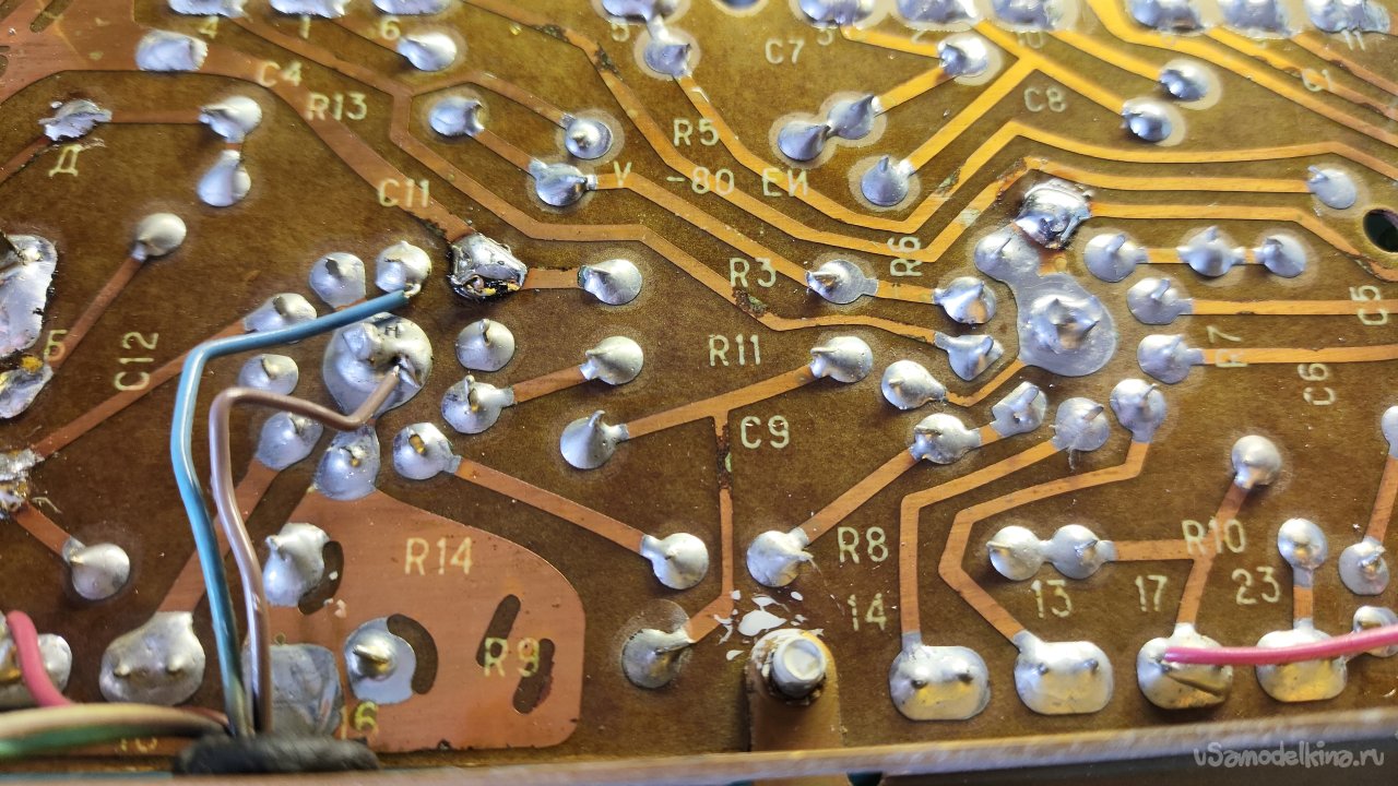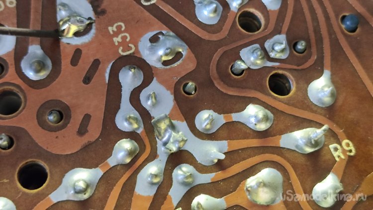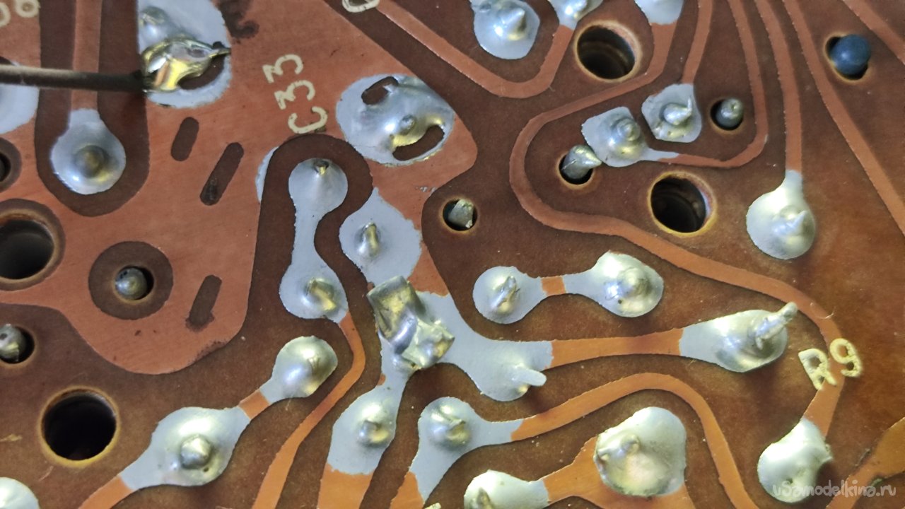 На плате усилителя НЧ нашел не пропаянные корпуса панелек ламп. Дорожки к ним идут, а пайки нет. У других ламп нет дорожек. Решил пропаять контакты, зачистил, залудил и запаял.