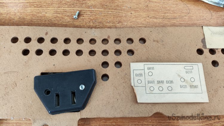 Открутил два винта и снял задний защитный экран из весьма рыхлого ДВП. На обратной стороне экрана есть небольшая памятка с типами и местами расположения радиоламп. Приятная мелочь, можно установить новые радиолампы, даже если нет ни схемы, ни ламп.
