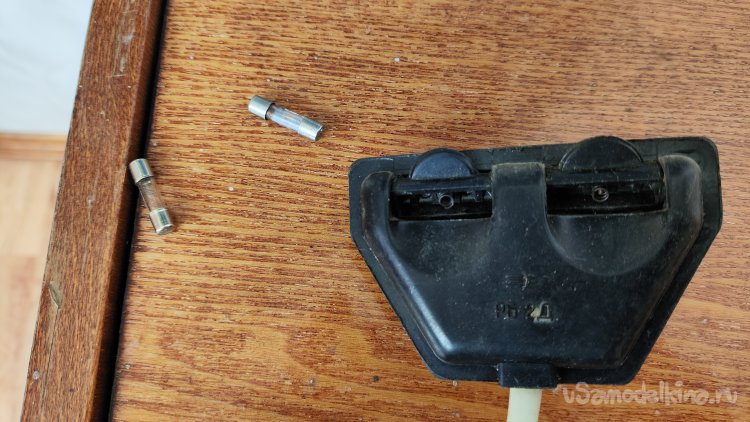 Открутив два винта, снял с заднего экрана разъем питания. Внутри живут два предохранителя. Один какой-то сильно мутный. Если он сгоревший, то ремонт может затянуться.