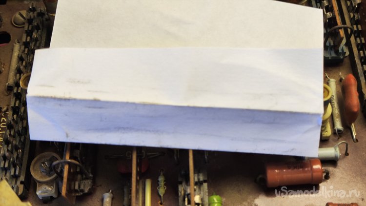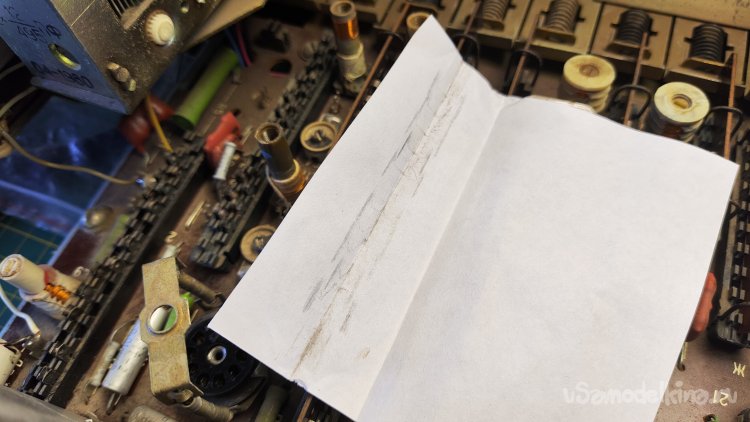 А вот впаянные контакты в плату почистить, не повредив слой посеребрения, не так-то просто. Но на помощь приходит обычный лист бумаги для заметок сложенный вдвое. Несколько движений бумагой и пятно контакта почищено. А больше и не надо.