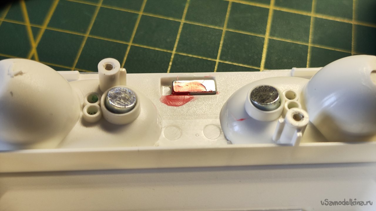 Вставил магниты фиксации наушников, они немного приподнимаются от действия магнита фиксации крышки. Капнул цианоакрилатного клея и прижал магниты, чтобы они приклеились в нужном положении.