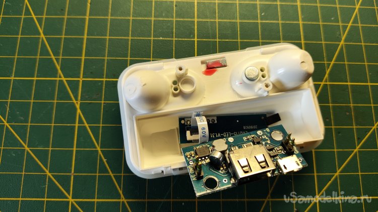 Открутил саморезы, фиксирующие основную плату к корпусу. На плате висит неодимовый магнит, выпавший из своего места. Магниты фиксации наушников не вклеены! Может поэтому наушники плохо держатся в своих местах зарядки?