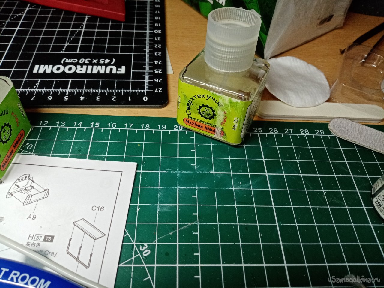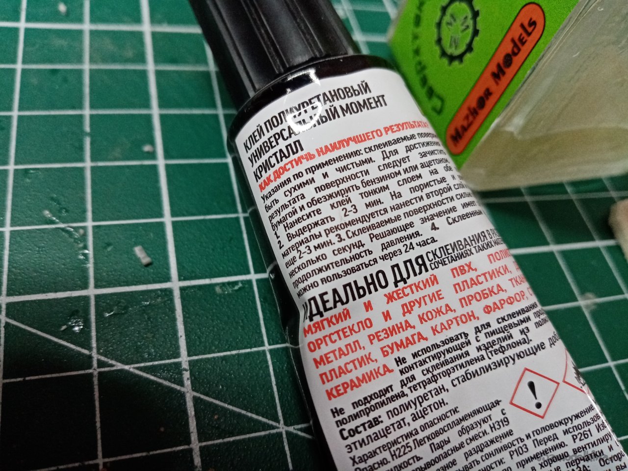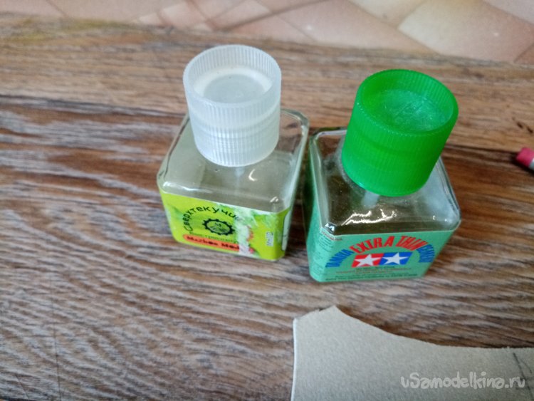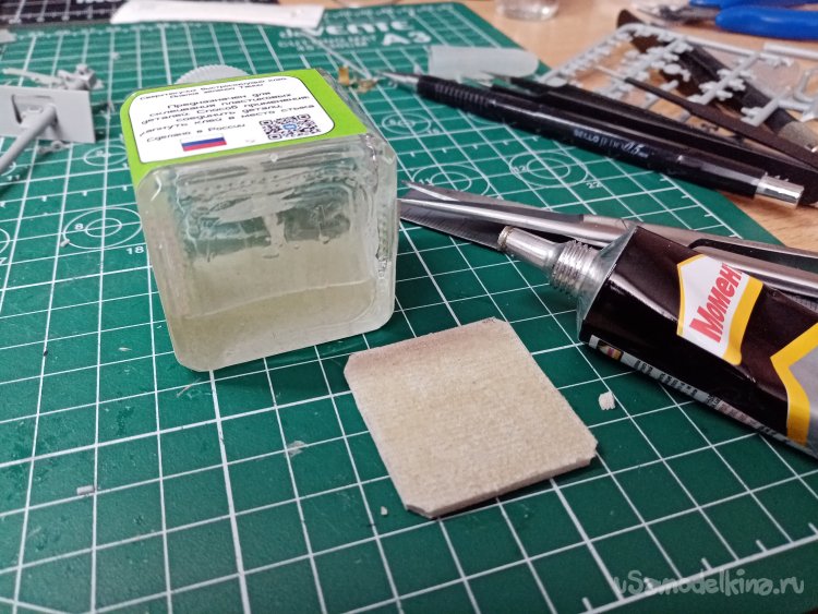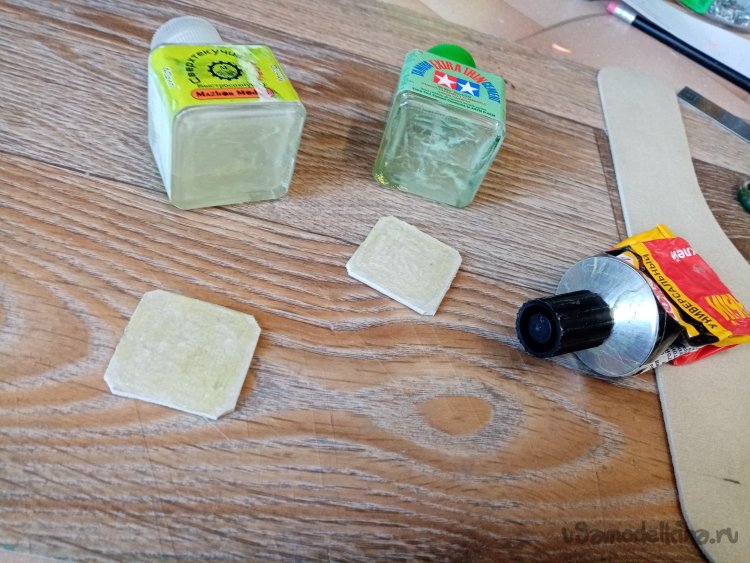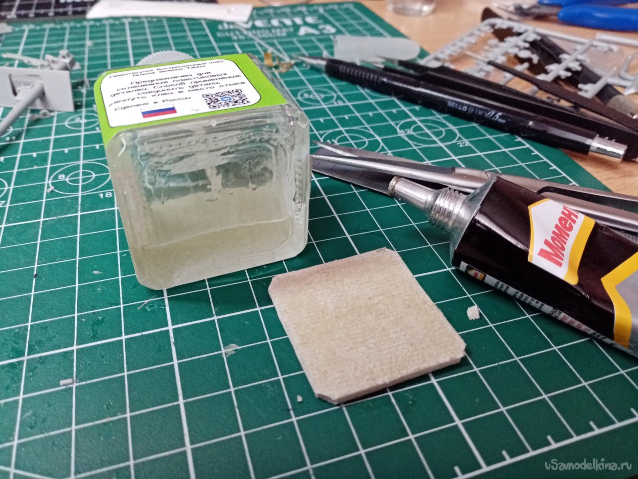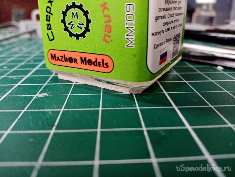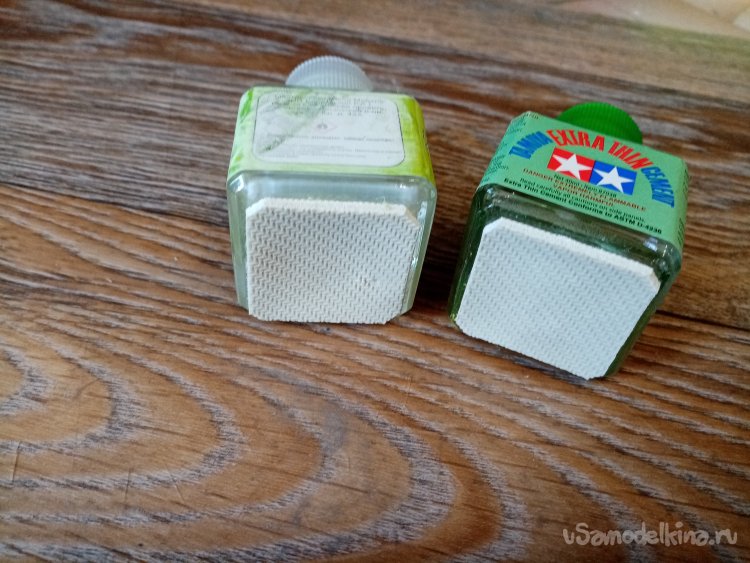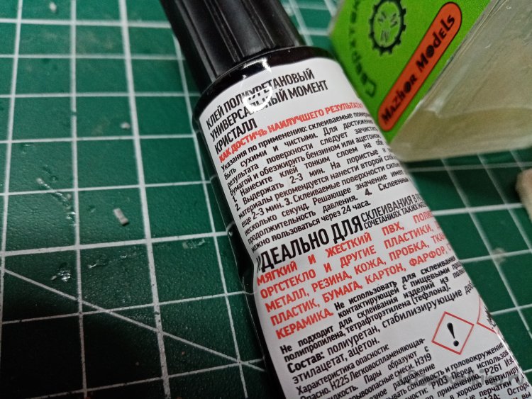 На рабочем месте в моделке произвел подобную операцию еще с двумя флаконами клея от Тамии и быстросохнущим клеем для моделей. Правда приклеивал квадратик коврика другим вариантом «Момента». Главное сильно прижать!
