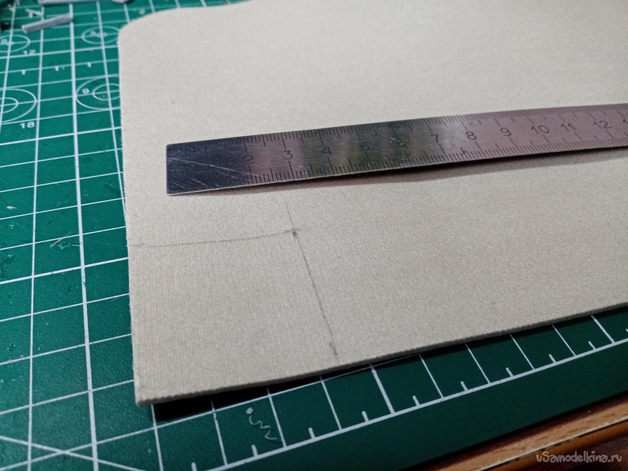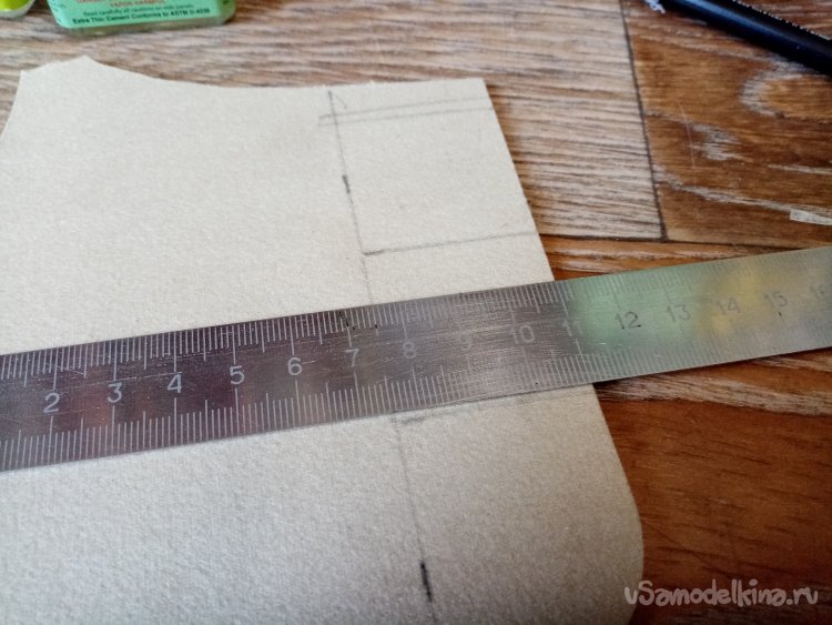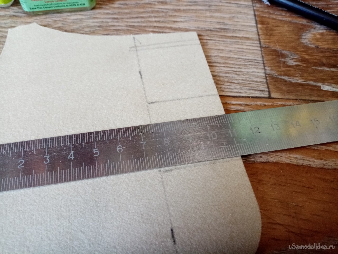 Размечаю квадратик нужного размера на тряпочной стороне коврика. Сначала хотел прочертить линии фломастером. Побоялся, что будет грязь размазана клеем при нанесении. Использовал карандаш.