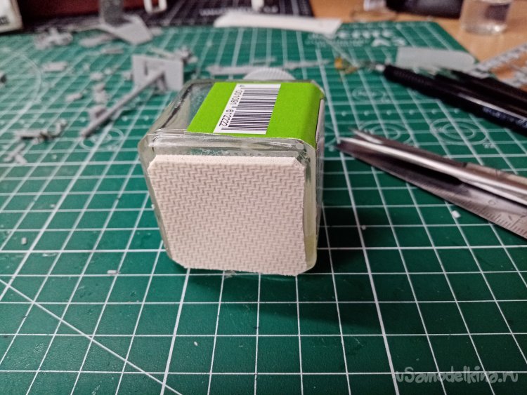 Работу по изготовлению противоскользящего донышка начал с хорошей фиксации крышки с кисточкой. Затем мера. Габариты флакона в донной части. Получается три с половиной сантиметра по квадратной стороне. Измерение производил металлической линейкой. Этому инструменту можно смело доверять такие ответственные действия.