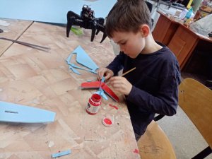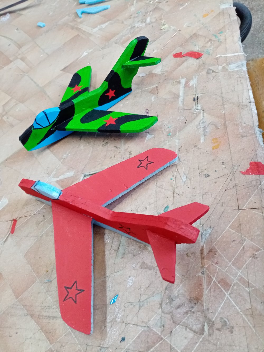 Поэтому будут делать простые самолетики по новому методу. Решил в качестве тренировки предложить ребятам изготовление самолетика по шаблонам. До этого они просто обводили карандашом и вырезали все заготовки ножом. Сейчас будут использовать струну для вырезания заготовок самолетика, тренироваться в этой процедуре.