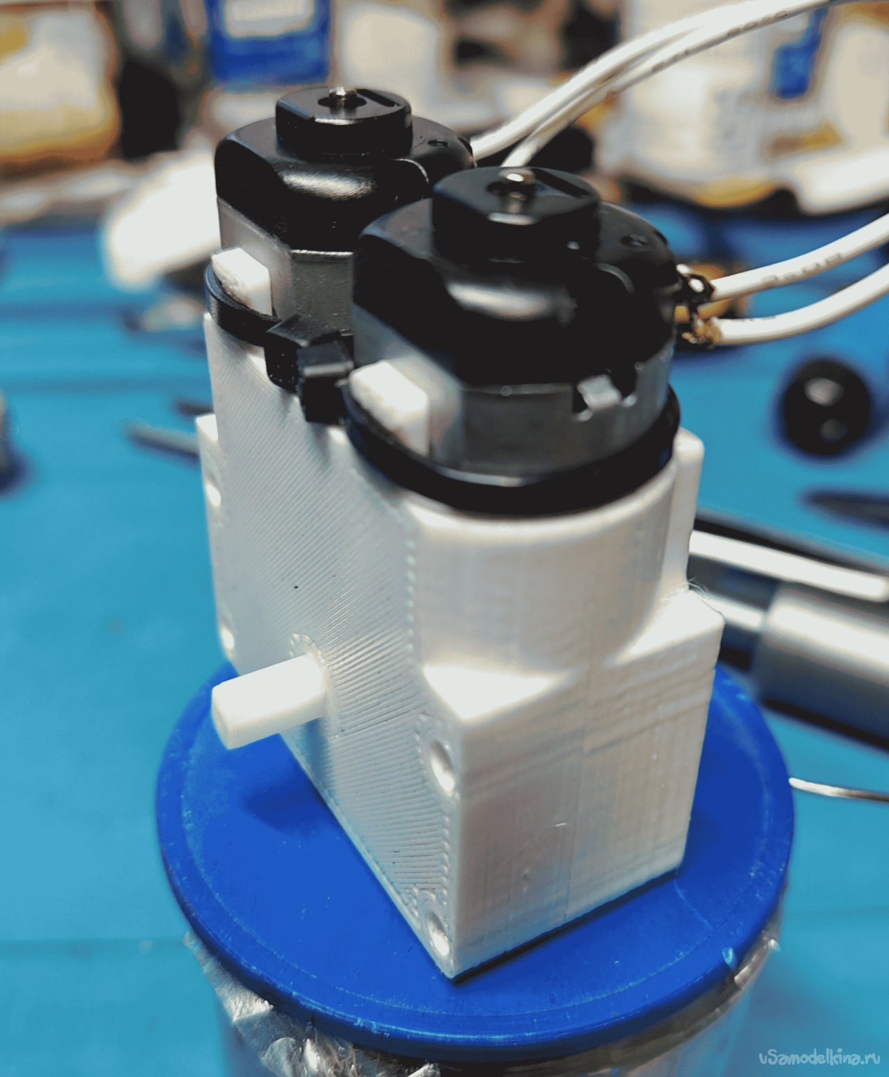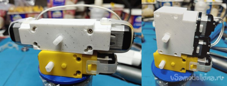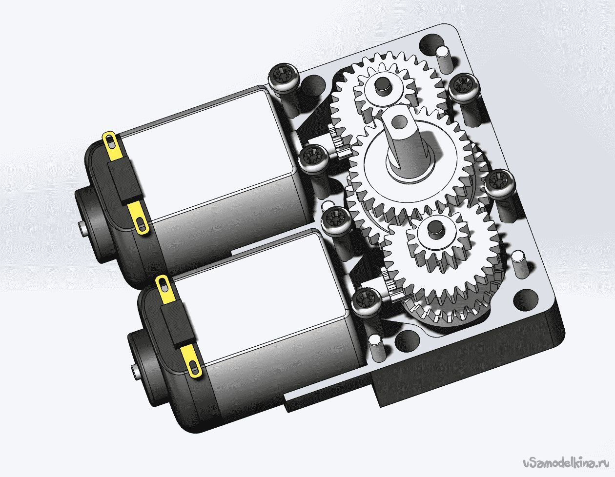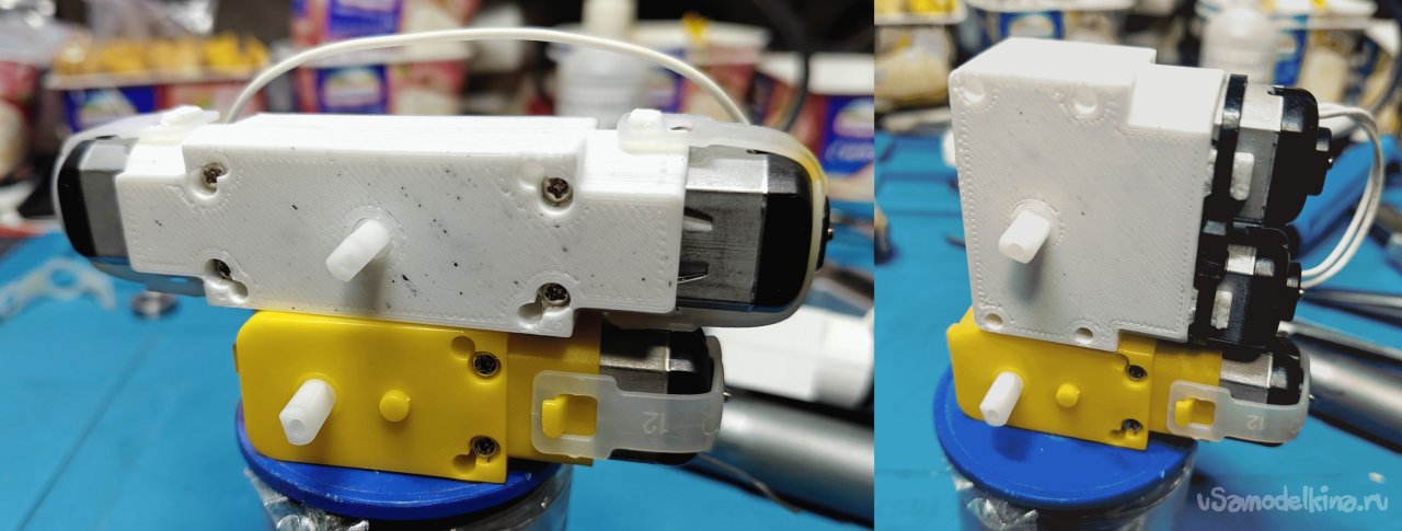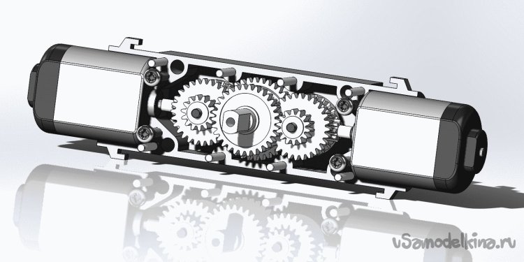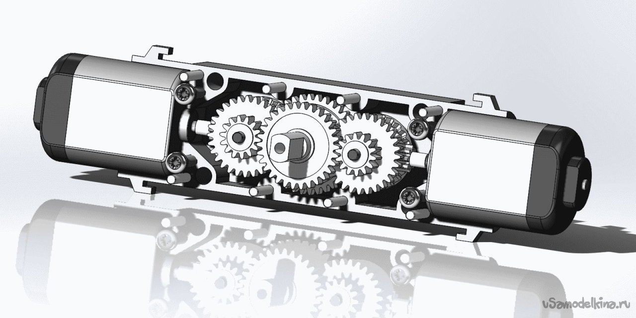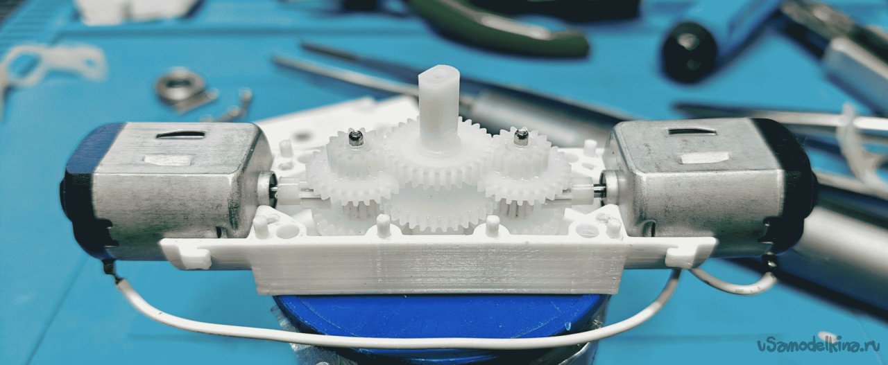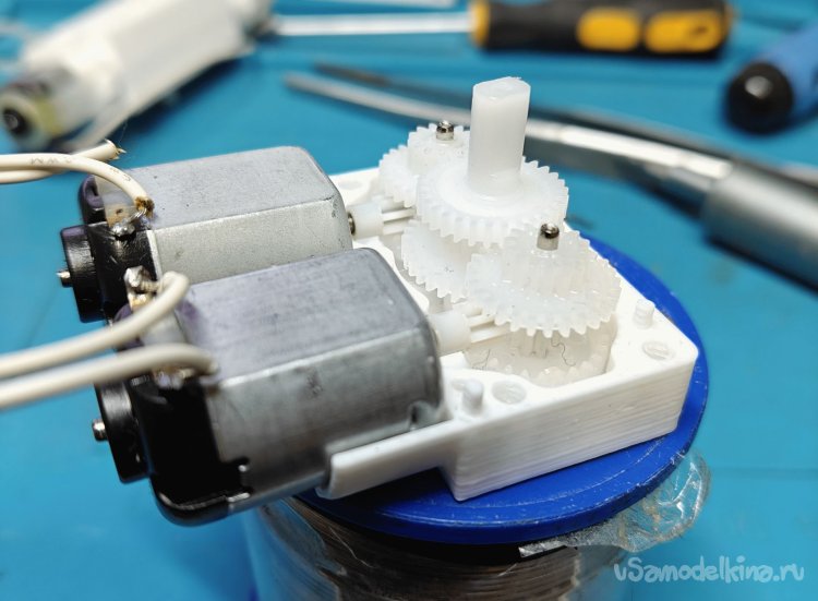 Здесь я попытался увеличить мощность этого моторчика путем решения проблемы «в лоб» - посадить на один редуктор два двигателя с максимальным использованием компонентов исходного (вернее двух исходных) «TT-motor».