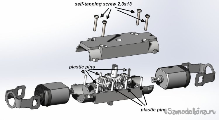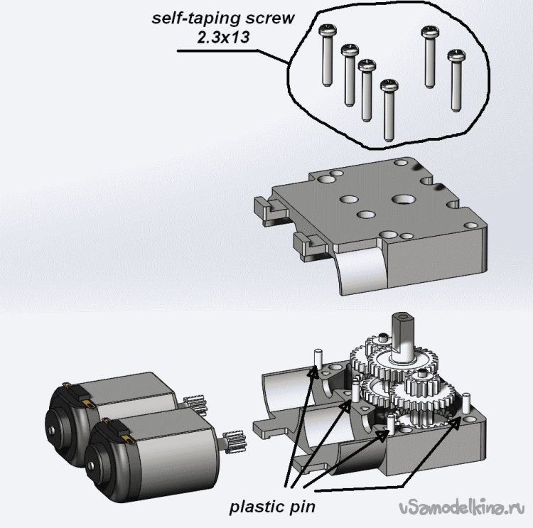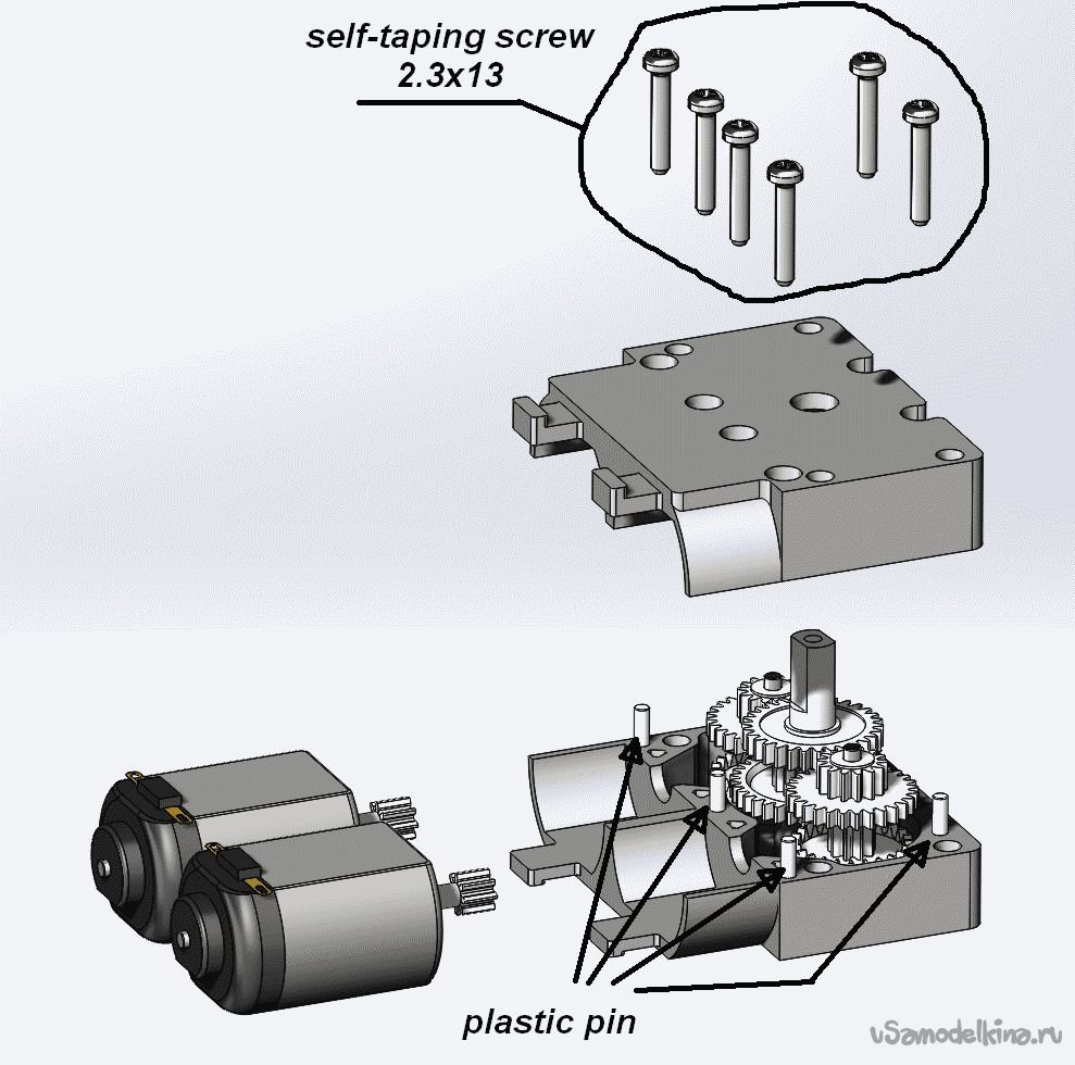 Здесь также как исходный материал использованы два покупных «TT-motor» - от них взяты двигатели, шестерни, оси и саморезы. Хомуты от двигателей красиво приспособить не получилось, поэтому для фиксации моторчиков были использованы кабельные стяжки для которых сделаны специальные хвостовики (см. фото общего вида). Также к исходным надо добавить еще два самореза. Половинки корпуса также распечатаны на 3D-принтере из PETG-пластика. «Plastic pins» на картинке - это штифты из кусочков филамента (Æ1.75мм). Штифты (5 шт.), исключающие смещение половинок корпуса, вставлены в отверстия Æ1.8мм, расположенные по периметру корпуса. Отверстия в половинках корпуса после печати необходимо очистить сверлом соответствующего диаметра, особенно тщательно в посадочных местах для осей шестеренок.