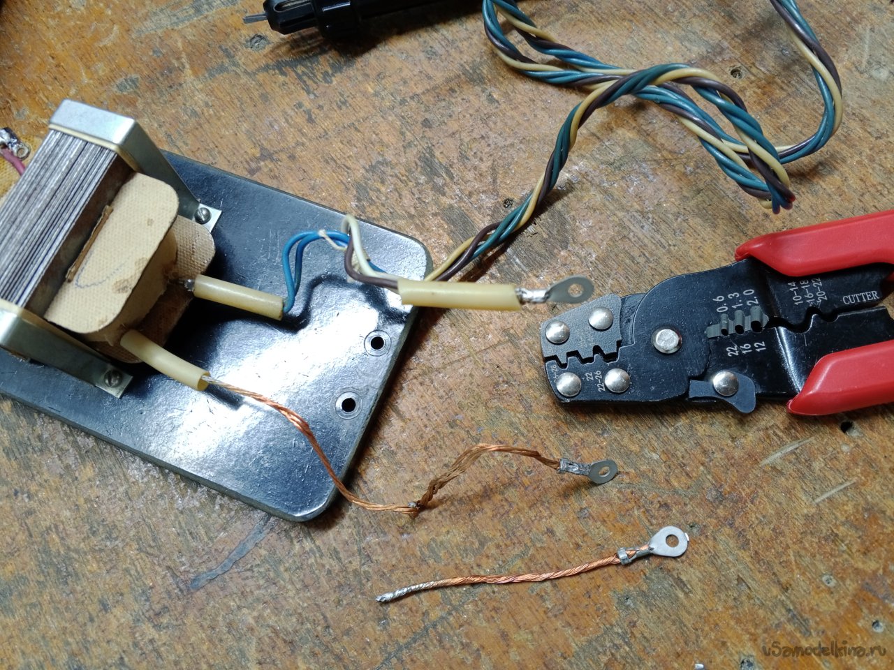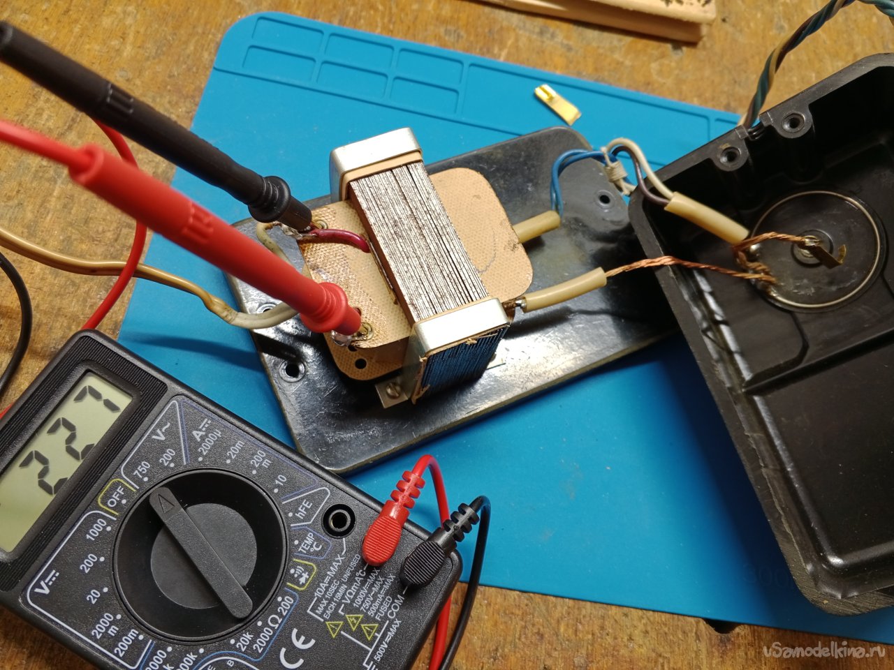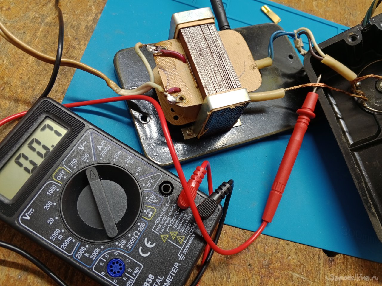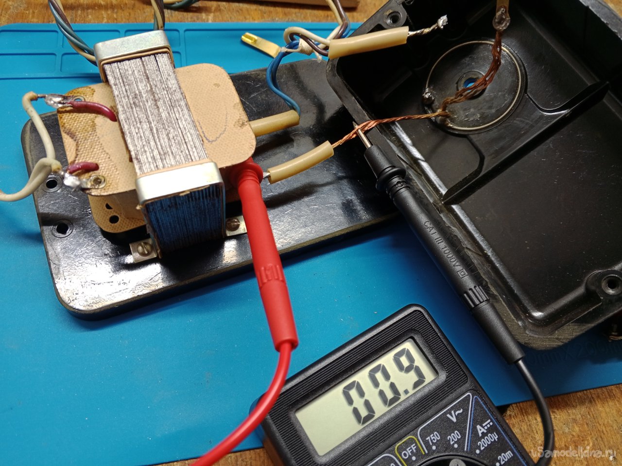 Решил измерить напряжение на выходе трансформатора без нагрузки, отпаял провод, идущий к нагревательному элементу, все равно перепаивать этот узел нужно будет. Замеры показали, 0,9 вольта на выходе и сопротивление резистивного элемента, получается, меньше Ома, по градации мультиметра.