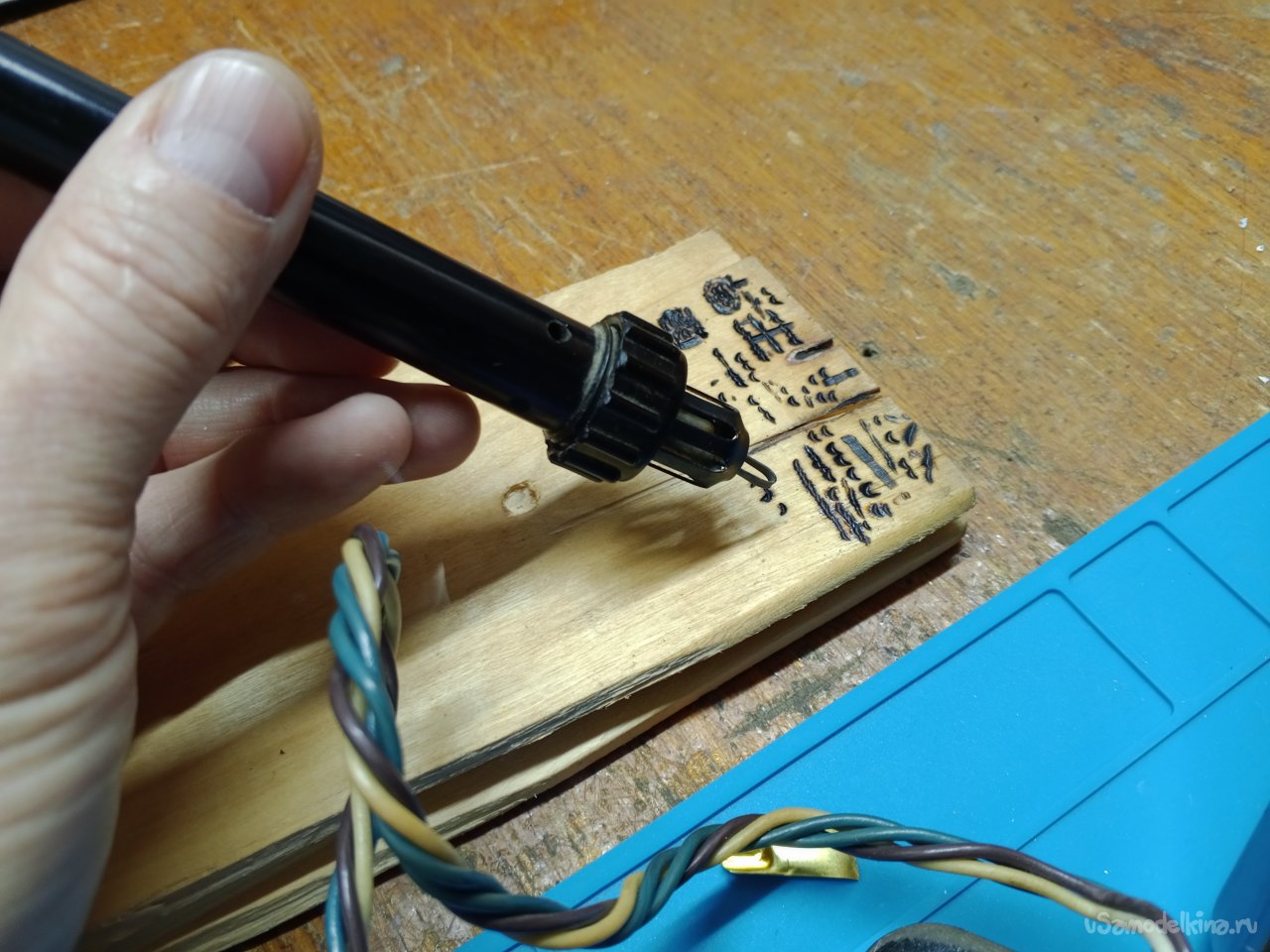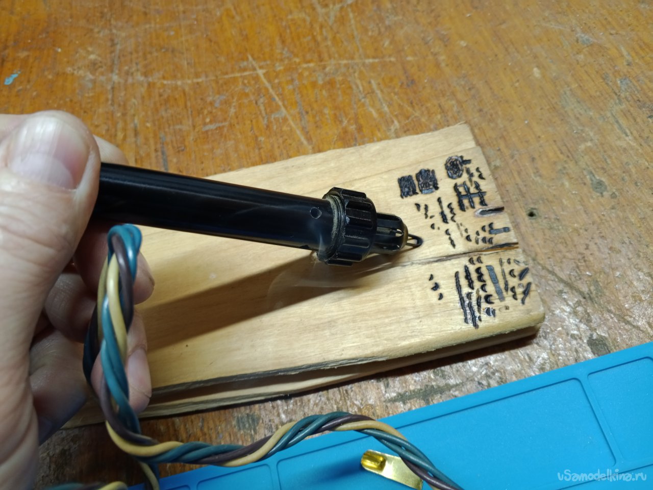 Потыкал жалом в деревяшку, выжигает, но «неохотно», потому что режим стоит «минимальный», т.е. ток проходит через полный резистивный элемент. Замкнул остаток ползунка, в место спайки проводов на держак, выжигать стало «веселее» - «полный нагрев».