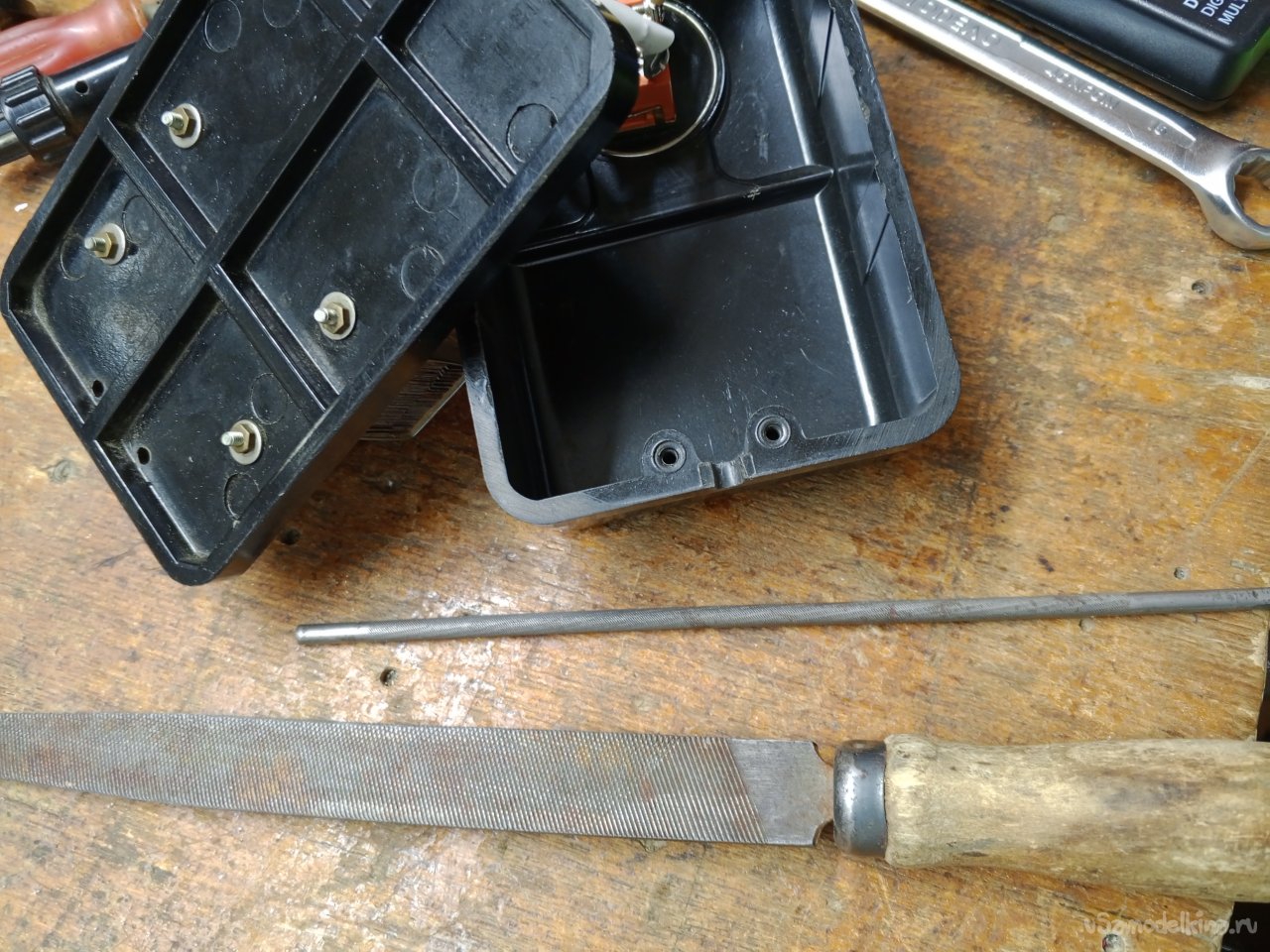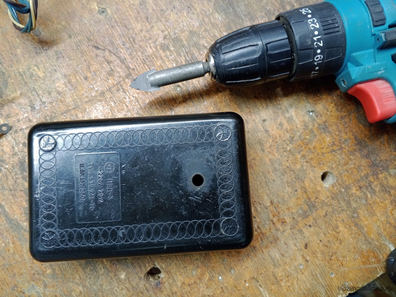 Чтобы не расколоть хрупкий карболитовый корпус, очень аккуратно, долго, с двух сторон, без нажима, рассверлил посадочное под тумблер отверстие.