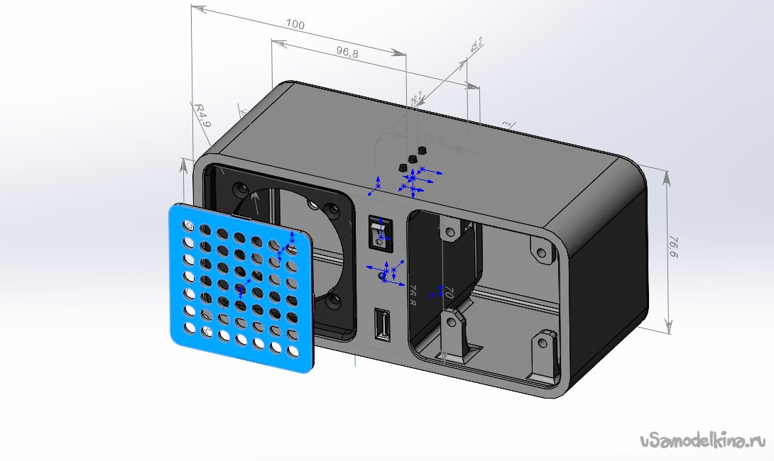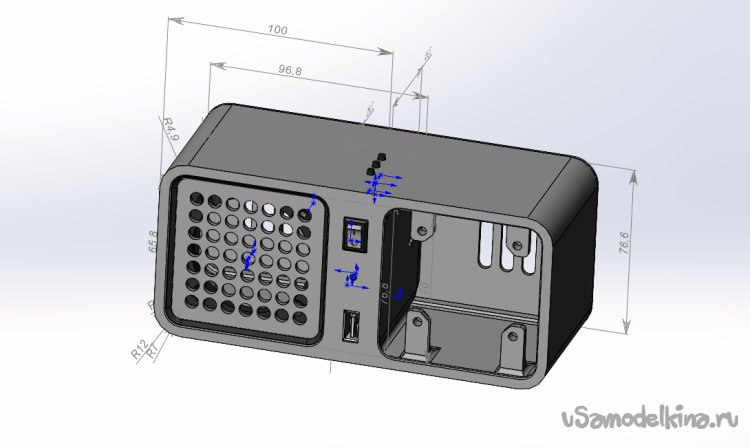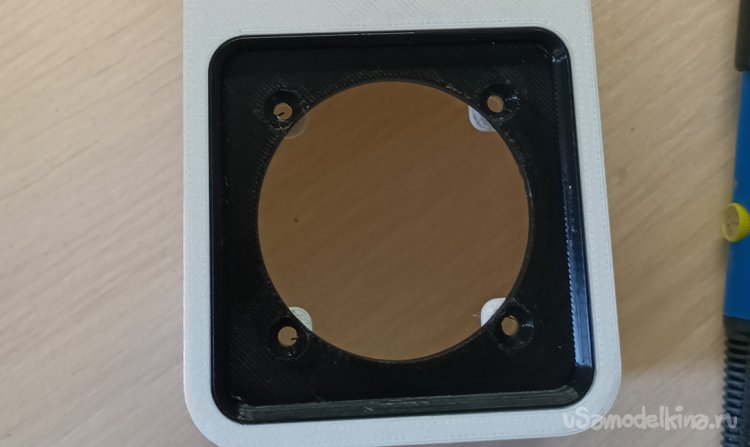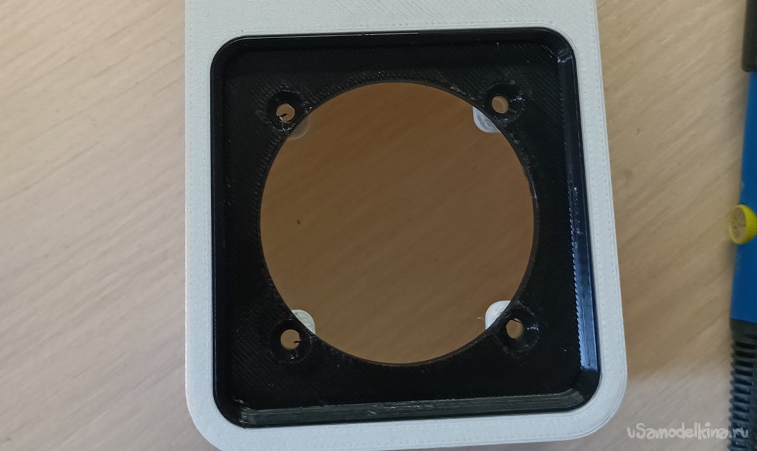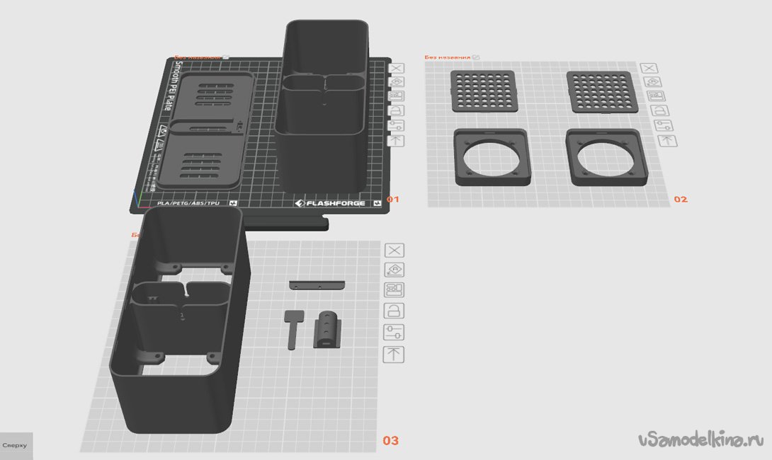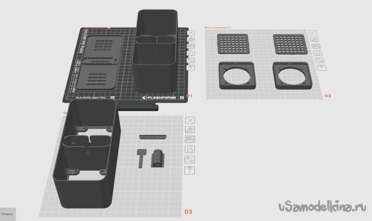 В слайсере выбрать стандартное или высокое качество печати. Распечатать все элементы корпуса. Корпус печатался "лицом" в стол с опцией «нечеткая оболочка» для придания эффекта шероховатости стенок (при этом маскируются линии слоев). Сам корпус печатается с поддержками и каймой. Задняя стенка, «сетки» и вставки печатаются без поддержек.