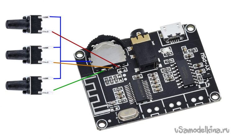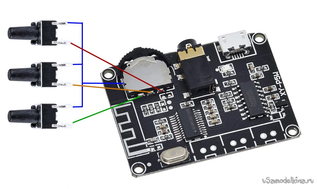 Подключение кнопок к плате конкретного BT-модуля (если на плате не предусмотрена контактная группа для управления громкостью) можно найти в интернете. В случае с XY-P5W 4 провода припаиваются к соответствующим выводам микровыключателя, расположенного на плате модуля.