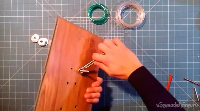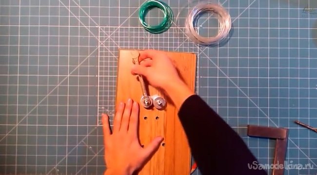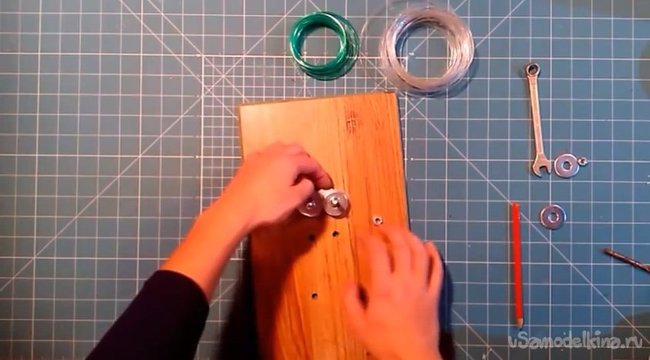 4. Чтобы нарезать ленту шириной в две толщины шайбы следует уложить на каждый болт по две шайбы. Затем одеваем на один болт лезвие канцелярского ножа. То есть толщина ленты будет зависеть от толщины и количества уложенных шайб под лезвием.