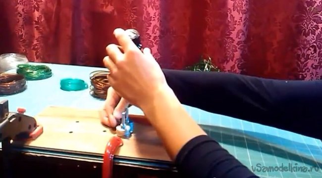 Отрезаем донышко от бутылки. Сначала делаем надрез ножницами, начало ленты. Затем просовываем кончик в станок, придерживаем бутылку и вытягиваем ленту.