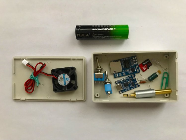 Для изготовления ПОЗУ потребуется стандартный пластиковый корпус (с толщиной стенок 2 мм) размерами 100 х 60 х 26 мм с захлопывающейся передней крышкой, 5-Вольтовый вентилятор размерами 30 х 30 х 10 мм, литий-ионный аккумулятор типоразмера 18650 3,7В; 2000 мА/час. И остальные детали, изображённые на рисунке 05. На фото отсутствует блок А2 и гнездо «Jack» 3,5 мм для подключения ГТ.