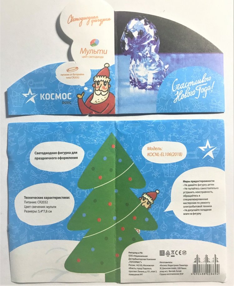 В схеме ПОЗУ применён резистор R1 типа ОМЛТ, С2-23, С2 - 33 или ему подобные с разбросом номиналов до ± 20 % и мощностью рассеивания 0,125 Вт. Резистор R2 – низкоомный типа ОМЛТ, МЛТ, МТ, С2-26, С2-33 с мощностью рассеивания 0,5 … 2 Вт (в случае использования ВА1). Конденсатор С1 – керамический типа КМ; С2 – оксидный К50-35 (или зарубежный). Светодиод HL1 (D = 5,1 мм.) RGBYW0 - 7 цветов (3,0 … 3,4 В; 20 мА) может быть заменён аналогичным, взятым из светодиодной фигурки собачки «Мультицвет светодиода» производства КНР (упаковку см. на рисунках 10 и 11). Выносная головка динамическая BA1 может быть любой широкополосной, желательно мощностью от 3 Вт с импедансом от 4 Ом и более.