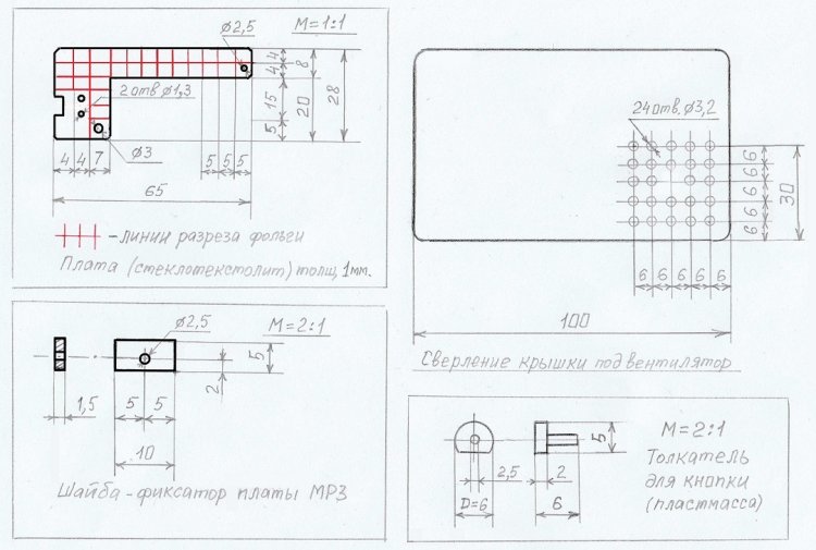 Эскизы трёх самодельных деталей и эскиз сверловки передней крышки корпуса для установки кулера М1. На рисунке 15 красным цветом показаны линии разреза медной фольги на плате, предназначенной для установки элементов SB1, R1 и для подпайки двух удлинённых выводов HL1.