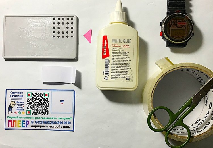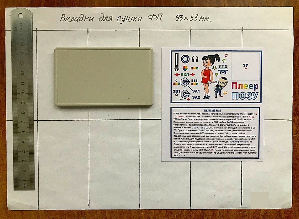 Перед приклеиванием рисунка ФП к передней крышке корпуса, из листа А4 следует нарезать несколько вкладок размером 93 х 53 мм для сушки ФП. Эти вкладки обеспечат плотное прижимание ФП к поверхности передней крышки с помощью любого ровного грузила (пресса). Инструкция «READ ME FILE» приклеивается к внутренней стороне крышки в сложенном виде.