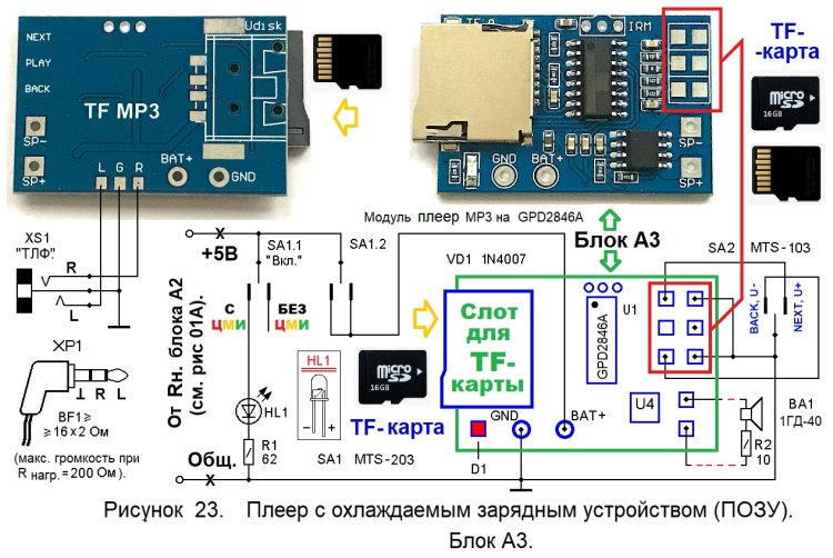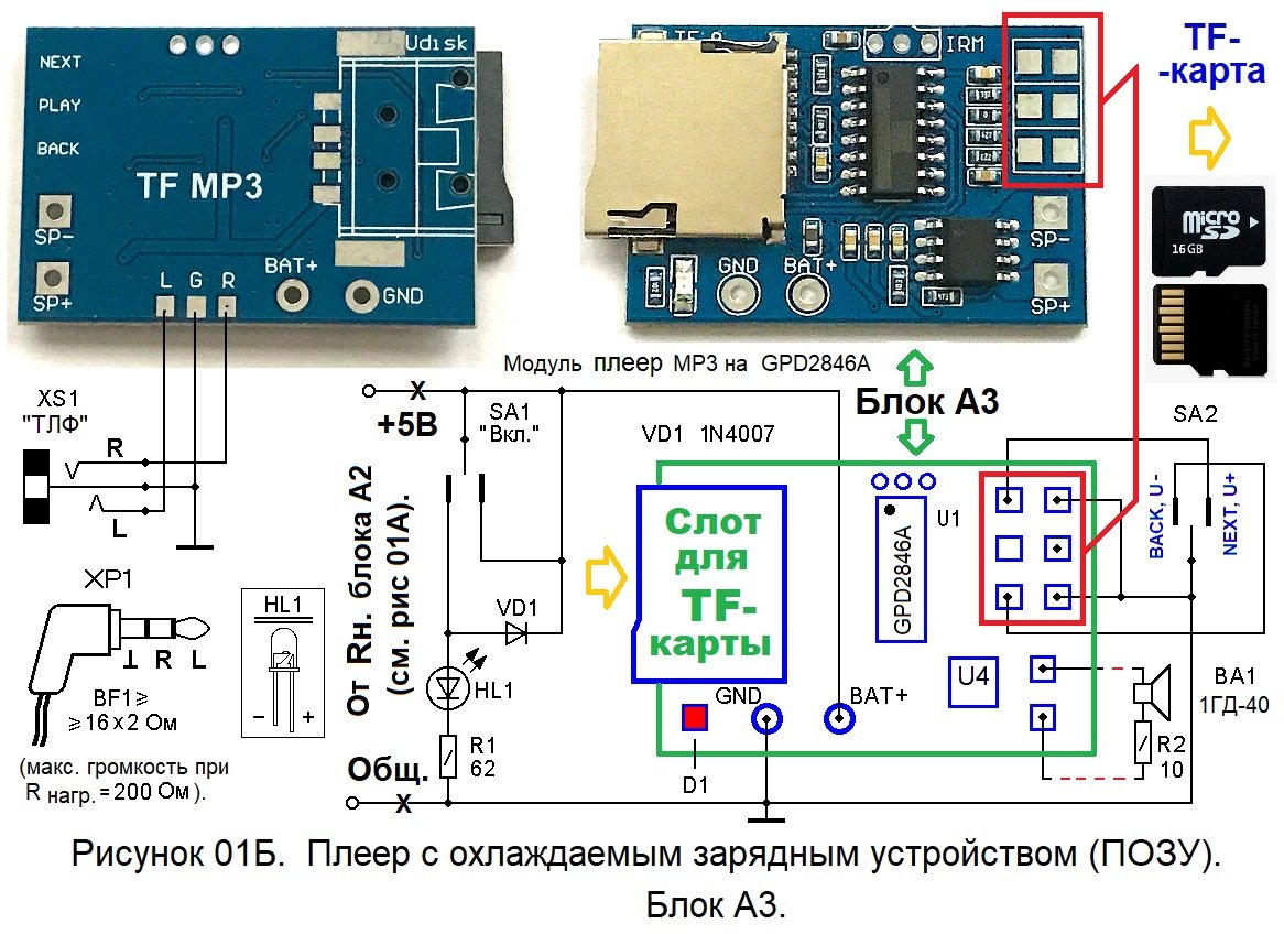 3). Блок А3 – это плеер МР3, поддерживающий TF-карты с объёмом памяти до 16 ГБ. Основу плеера производства КНР составляет ИМС с наименованием GPD2846A.