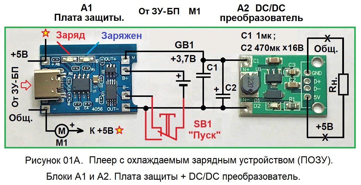 5). Простой заряд аккумулятора, от встроенного в плеер охлаждаемого зарядного устройства. Кулер улучшает температурный режим блока А1 – платы защиты и значительно продлевает срок его службы.