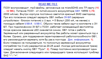 Набор предустановок, имевших место на момент выключения питания, запоминается. Запоминаются громкость и момент, при котором трек был выключен. То есть при повторном включении питания трек включается не с начала, а с места его выключения. На карте кроме единственного большого файла можно записать сотни музыкальных и голосовых треков. Важно только, чтобы суммарный размер треков не превышал объём 90 … 95% памяти TF-карты.