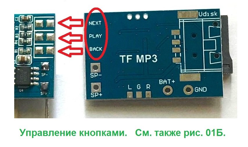 2). «NEXT» / «BACK» - следующий / назад (предыдущий). Команды выполняются краткими (до 0,3 секунды) установками тумблера SA1 влево или вправо (соответственно) с последующим возвращением тумблера в нейтральное положение. Причём эти команды выполняются только если на TF-карту записано два и более треков.