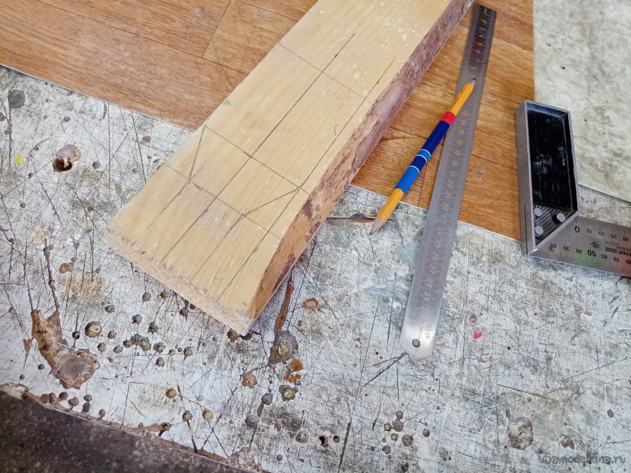 Нахожу кусок бруска примерного сечения. Размечаю при помощи угольника линейки и карандаша конструкцию.