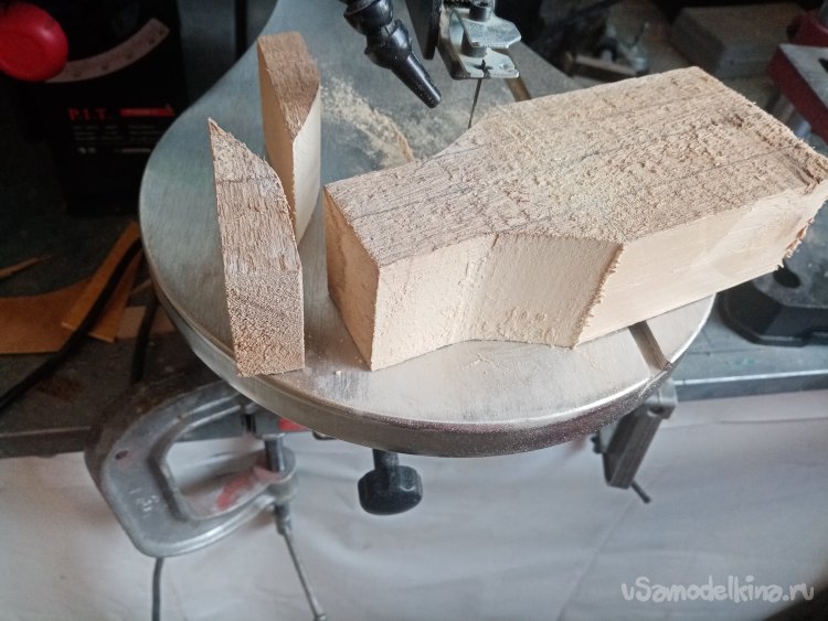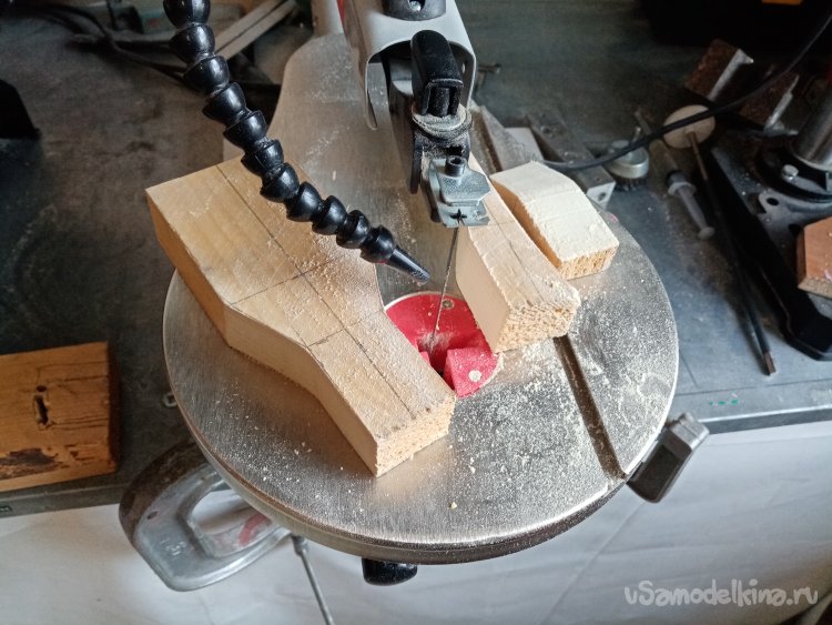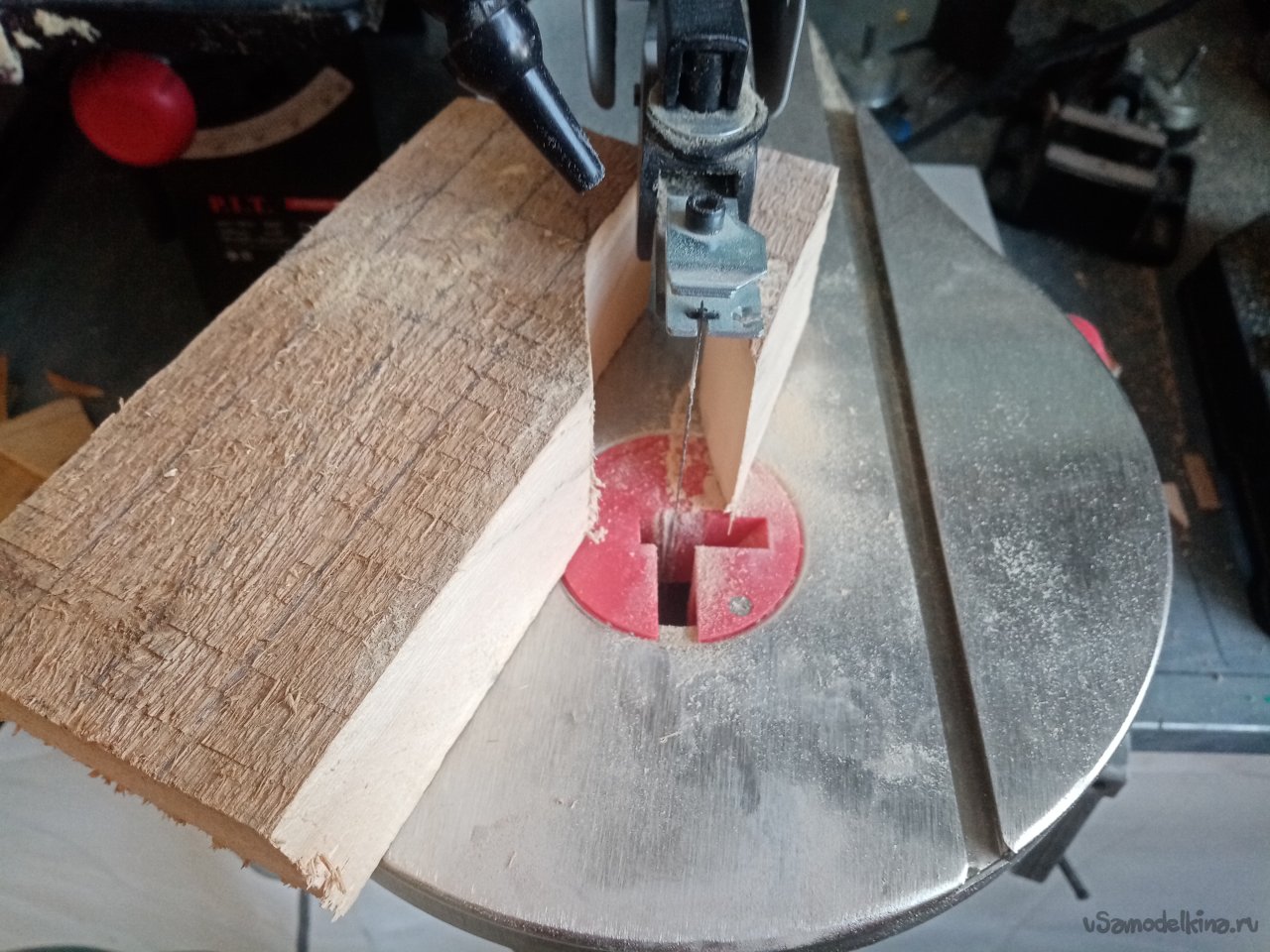 Никогда не пилил на механическом лобзике деревяшку такой толщины. Меняю лезвие на новое. Медленно и аккуратно делаю первый пропил. И второй. Боковинки отрезал.