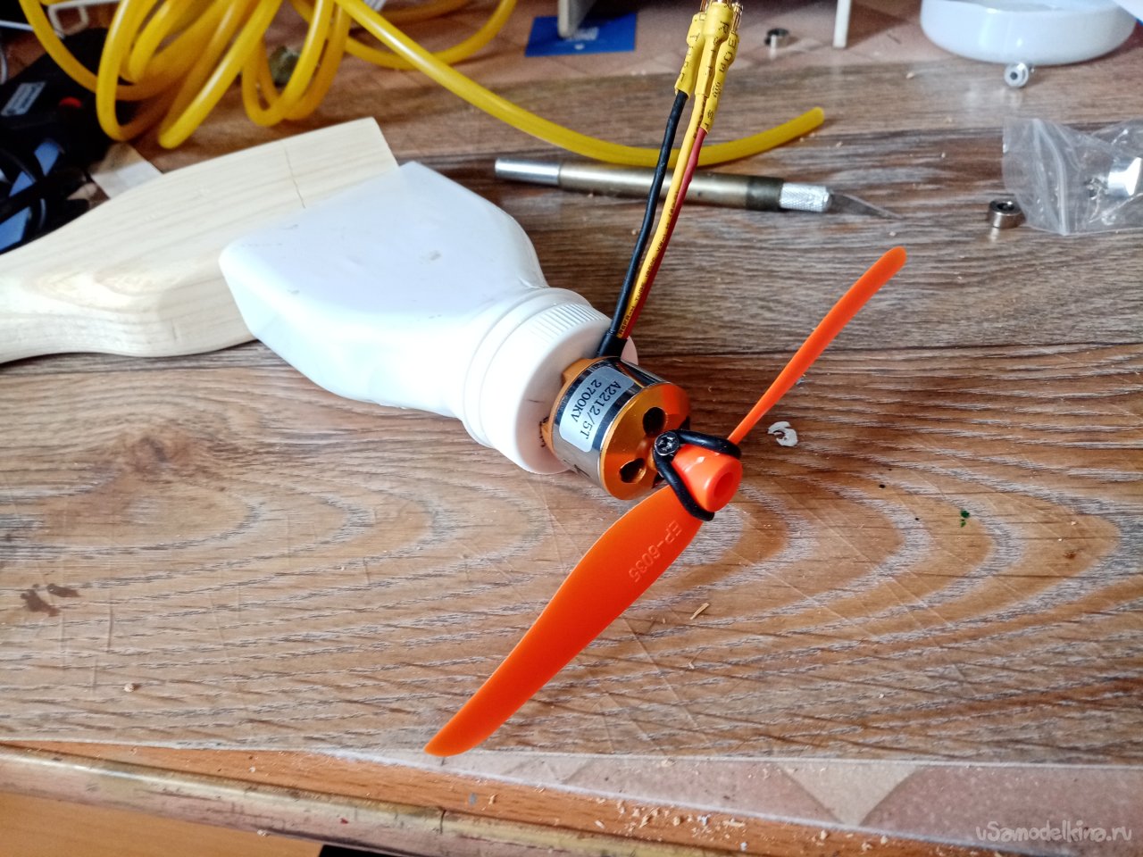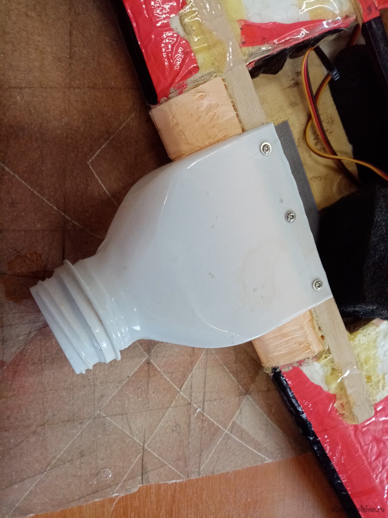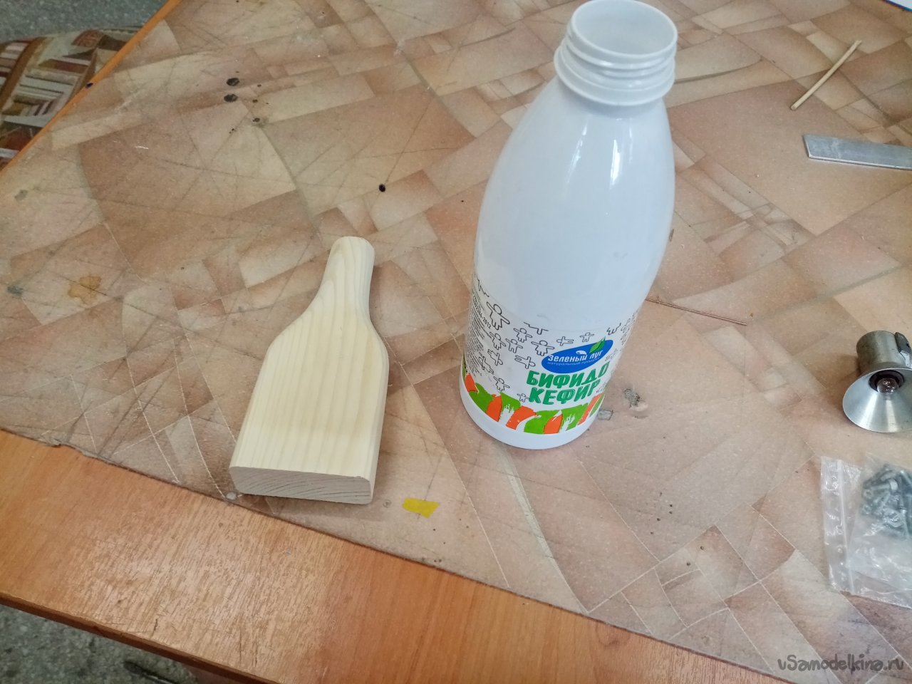 Возникла проблема в креплении двигателя на переднюю кромку крыла. Несколько вариантов дали неоднозначный результат. Более тяжелые моторамы вызывали большое смещение центра тяжести. Как известно летающие крылья очень чувствительны к изменению ЦТ. Сдвигаем буквально на пару сантиметром и бойцовка не летит. Поскольку нет стреловидности. В плане это просто прямоугольная доска. Чем и определяется хорошая маневренность на больших скоростях. При столкновении с землей при жестких посадках моторама выламывала переднюю кромку крыла, не помогала и рейка впереди. Мозговой штурм привел к закономерному решению. Изготовить мотораму из ПЭТ бутылки. Получится прочная и легкая конструкция. При сильном ударе сомнется и тут два варианта, или просто выправляем смятую конструкцию. Можно и заменить, хорошо бы сделать и мотораму легко снимающуюся. Если есть повреждение двигателя, его можно было легко сменить. Для этой цели нужно придумать простое крепление на передней кромке крыла. Бутылка ото «пепси» не подошла. Маленькое горлышко не позволяет закрепить двигатель. Взор пал на бутылку из под молока. Пробка достаточного диаметра, можно закрепить двигатель через заднюю часть. Замена его тоже не представляет большой проблемы. Достаточно скрутить пробку с поврежденным двигателем и прикрутить с новым. Разрезаю бутылку, приклеиваю на усиленный скотч, все нормально, полетели. Стукнул пару раз о землю. Как и предполагал моторама сложилась. Выпрямил руками и снова в полет. Двигатель и винт жалко конечно. Но что делать, в бою все будет иначе. Можно установить складывающийся винт, целее будет. Но диаметр моторамы гораздо больше толщины крыла и неудобно крепить. Решил изготовить деревянную болванку для осаживания бутылки под нужный размер. Идея продумана, можно начинать.