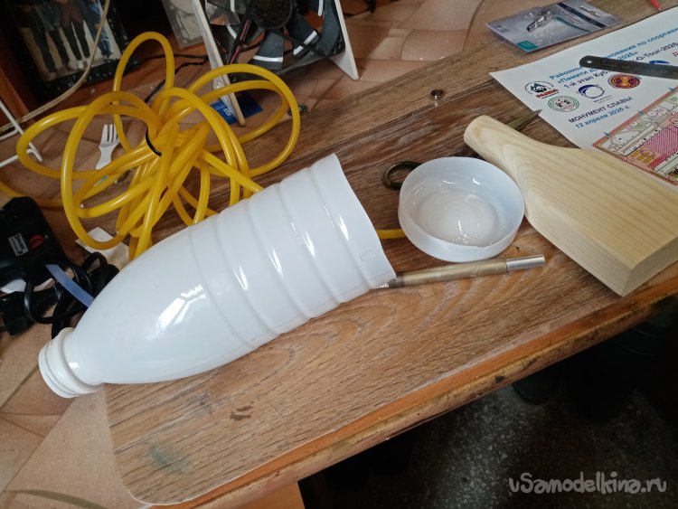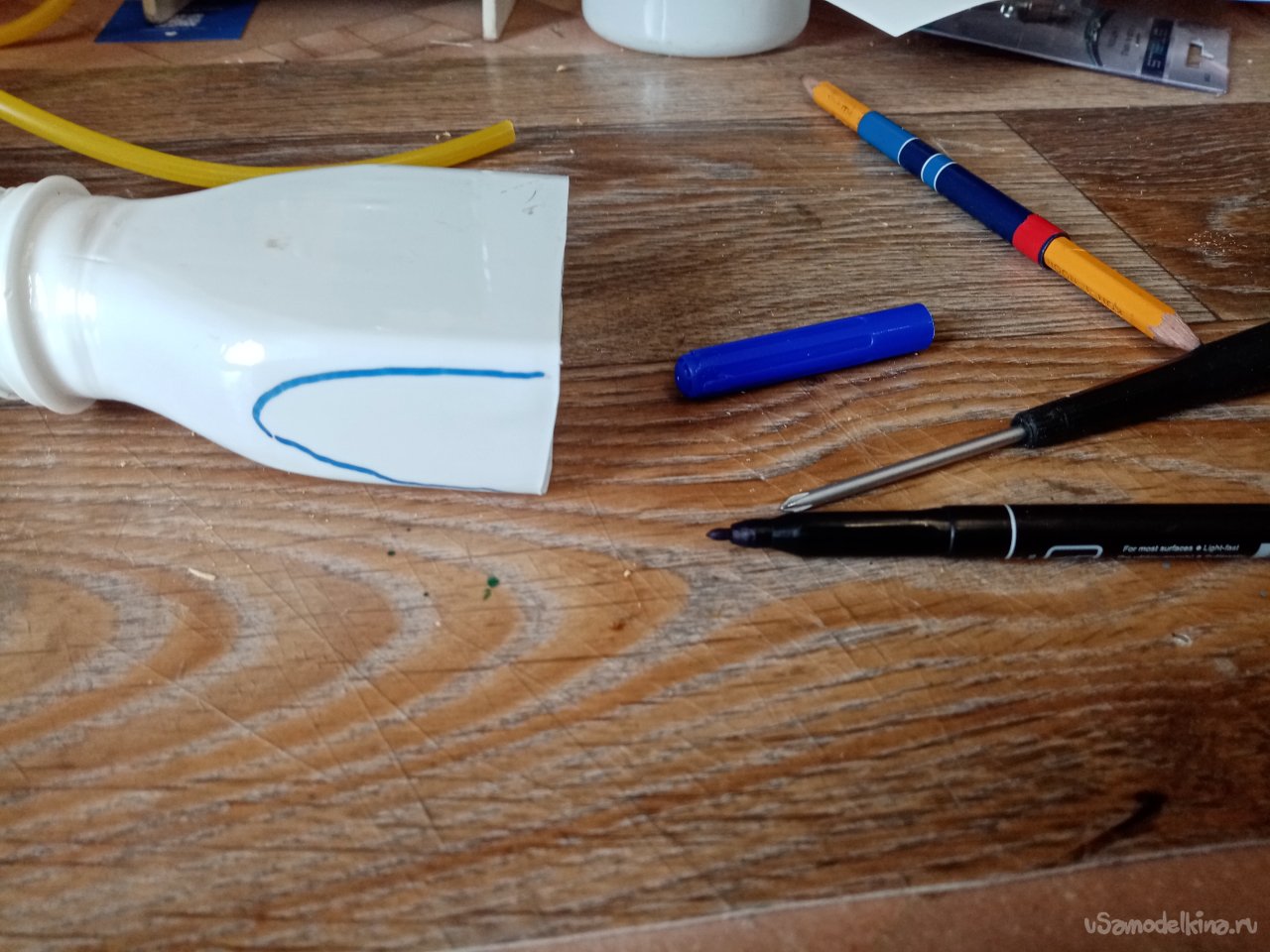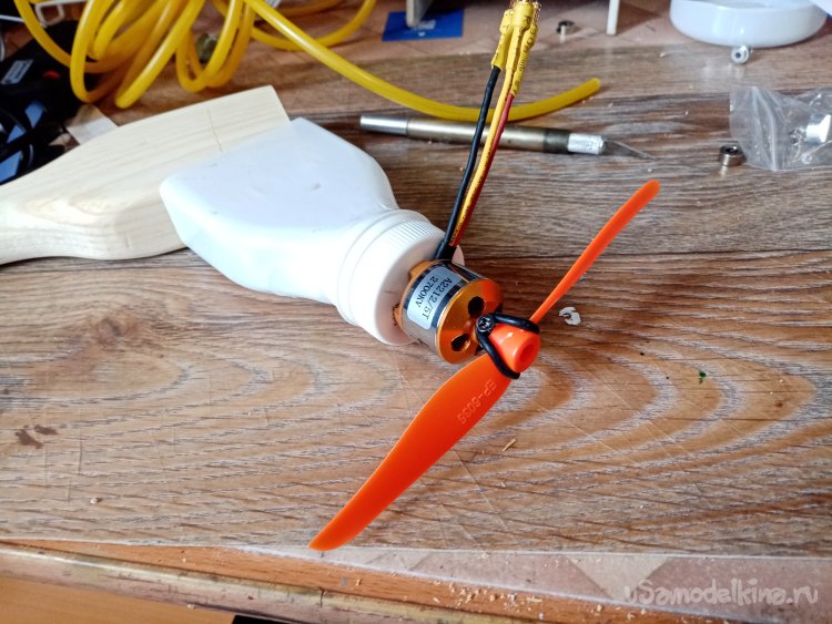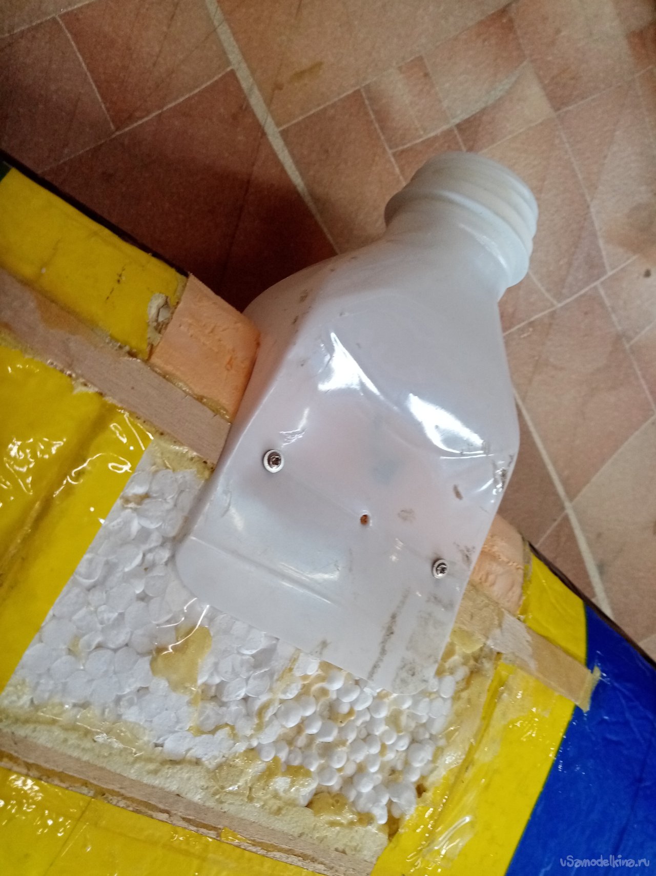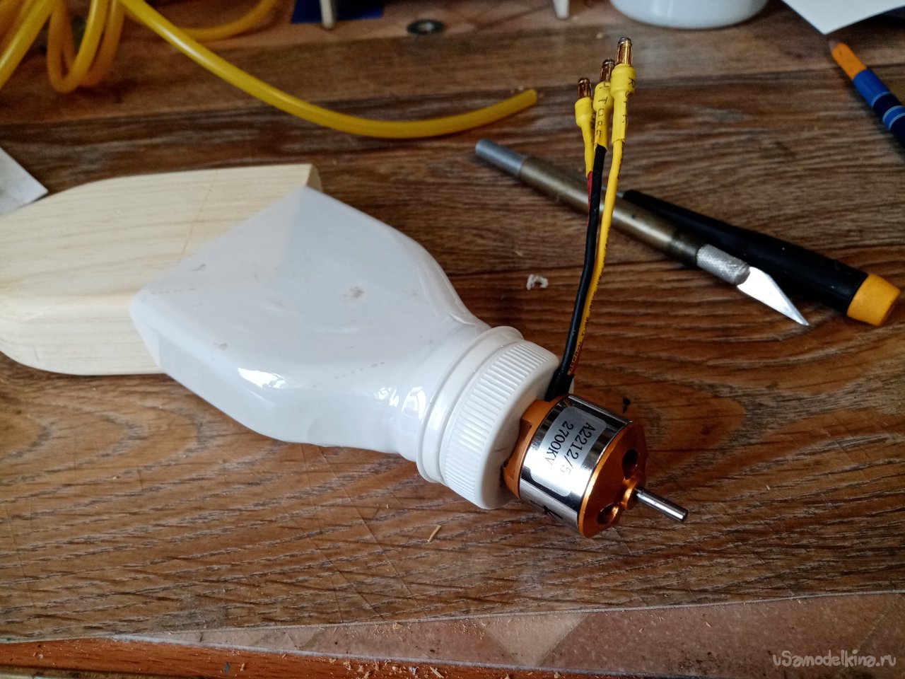 Возникла проблема в креплении двигателя на переднюю кромку крыла. Несколько вариантов дали неоднозначный результат. Более тяжелые моторамы вызывали большое смещение центра тяжести. Как известно летающие крылья очень чувствительны к изменению ЦТ. Сдвигаем буквально на пару сантиметром и бойцовка не летит. Поскольку нет стреловидности. В плане это просто прямоугольная доска. Чем и определяется хорошая маневренность на больших скоростях. При столкновении с землей при жестких посадках моторама выламывала переднюю кромку крыла, не помогала и рейка впереди. Мозговой штурм привел к закономерному решению. Изготовить мотораму из ПЭТ бутылки. Получится прочная и легкая конструкция. При сильном ударе сомнется и тут два варианта, или просто выправляем смятую конструкцию. Можно и заменить, хорошо бы сделать и мотораму легко снимающуюся. Если есть повреждение двигателя, его можно было легко сменить. Для этой цели нужно придумать простое крепление на передней кромке крыла. Бутылка ото «пепси» не подошла. Маленькое горлышко не позволяет закрепить двигатель. Взор пал на бутылку из под молока. Пробка достаточного диаметра, можно закрепить двигатель через заднюю часть. Замена его тоже не представляет большой проблемы. Достаточно скрутить пробку с поврежденным двигателем и прикрутить с новым. Разрезаю бутылку, приклеиваю на усиленный скотч, все нормально, полетели. Стукнул пару раз о землю. Как и предполагал моторама сложилась. Выпрямил руками и снова в полет. Двигатель и винт жалко конечно. Но что делать, в бою все будет иначе. Можно установить складывающийся винт, целее будет. Но диаметр моторамы гораздо больше толщины крыла и неудобно крепить. Решил изготовить деревянную болванку для осаживания бутылки под нужный размер. Идея продумана, можно начинать.