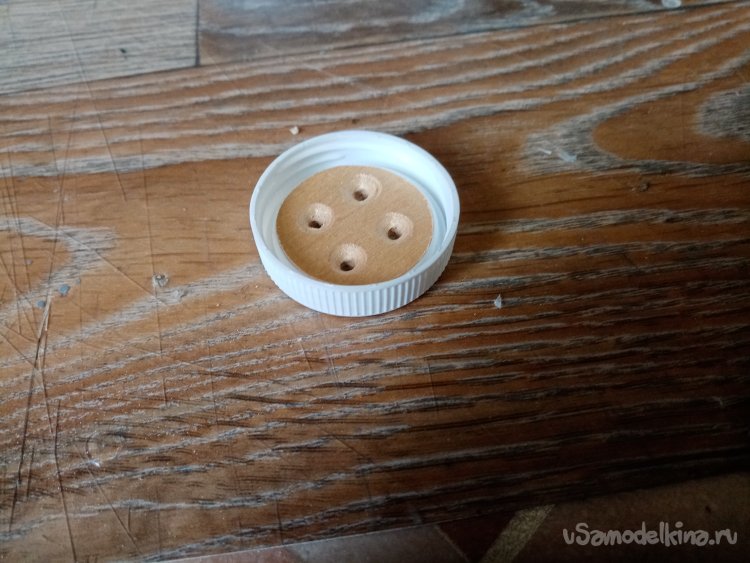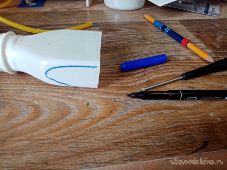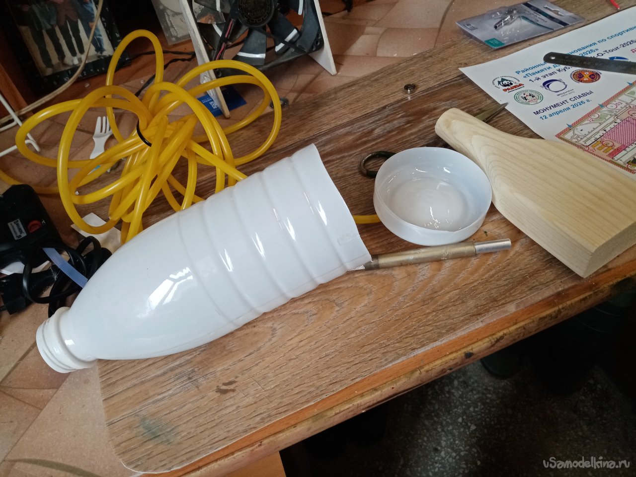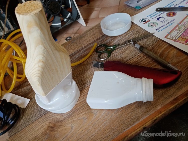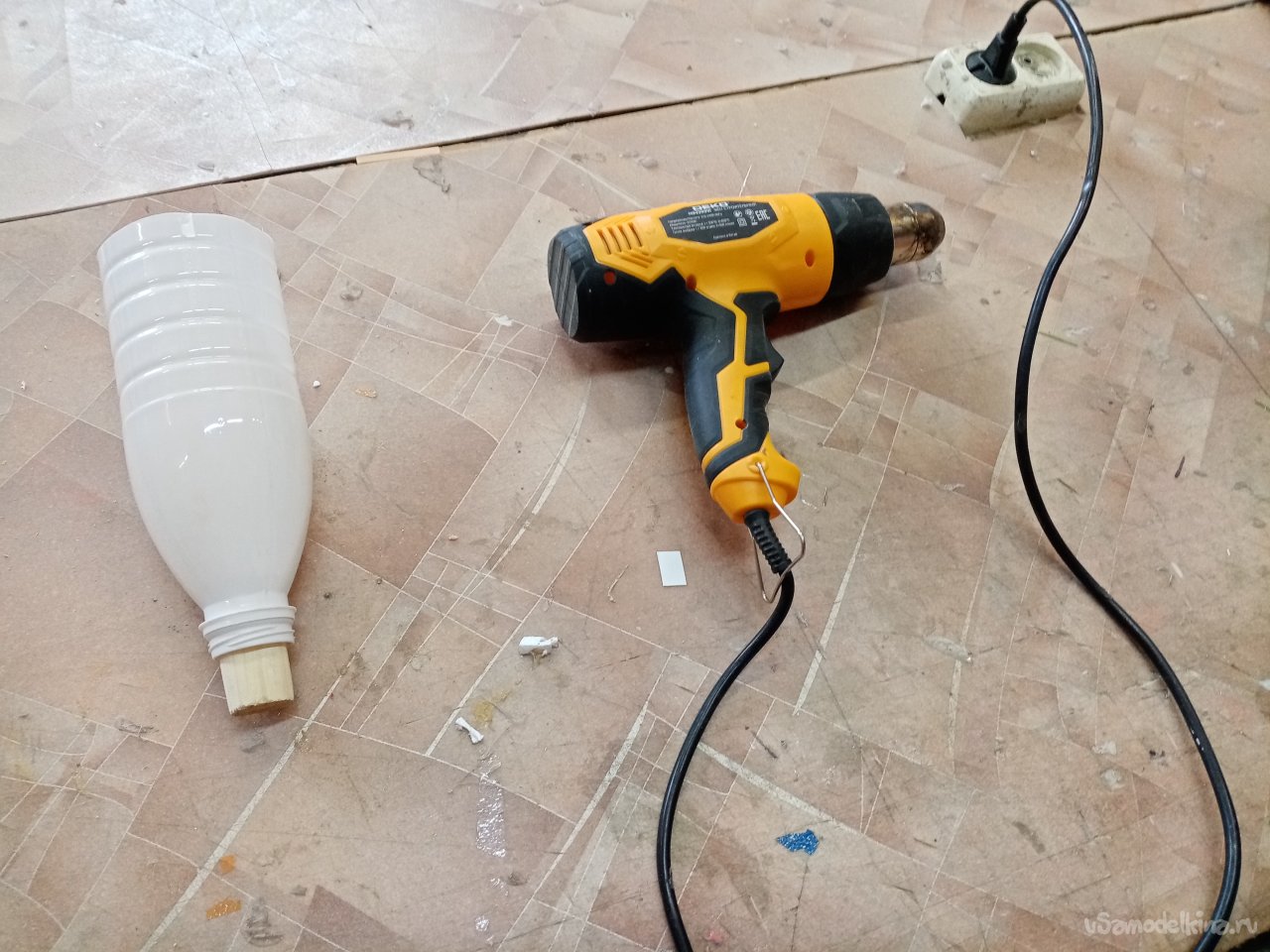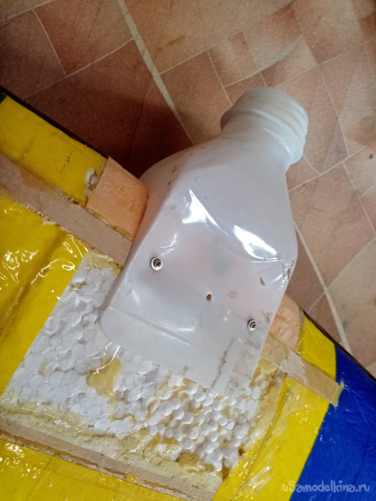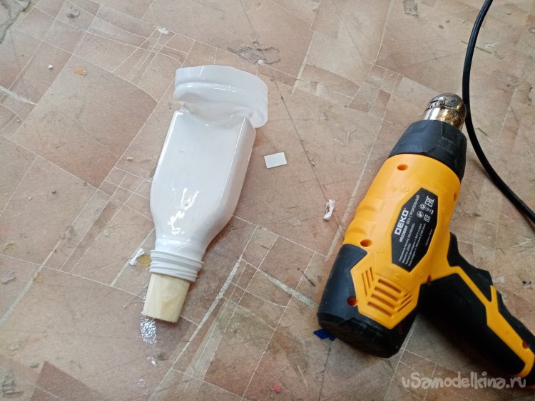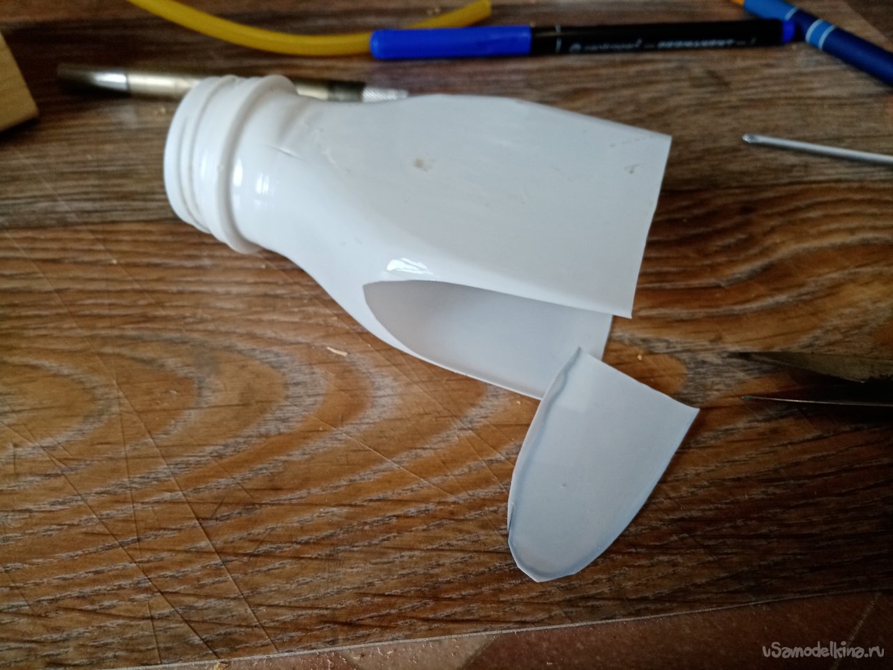 Настал черед белой бутылки из под молока. Отрезаю донышко гораздо длиннее деревяшки.