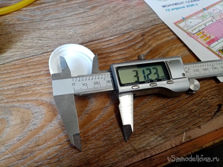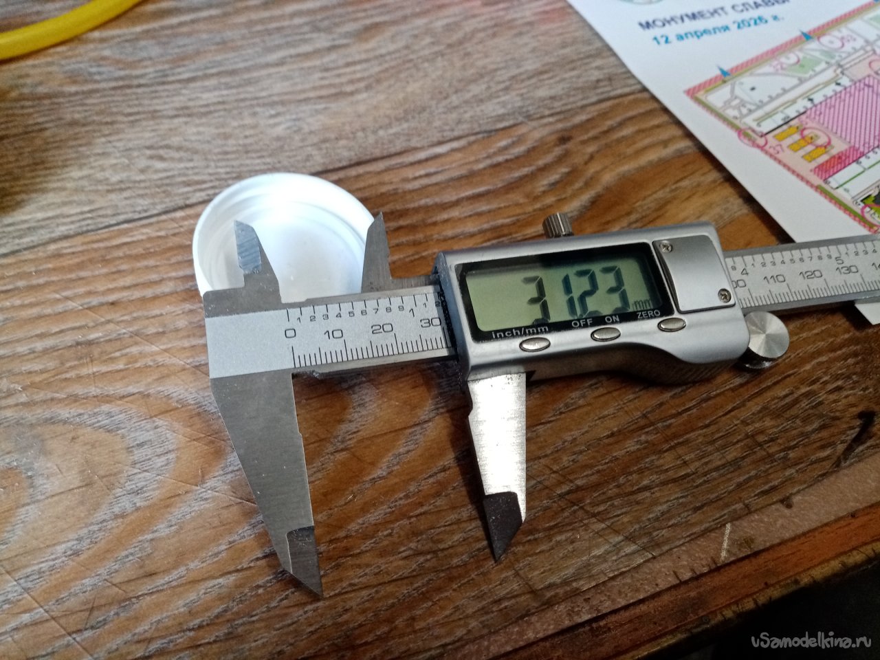 На внутреннюю поверхность крышки решил установить кружок усиления из 4 мм шлифованной фанеры. Измеряю диаметр будущей заготовки при помощи цифрового штангельциркуля. Вычерчиваю кружок циркулем.