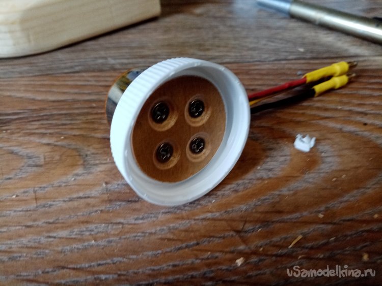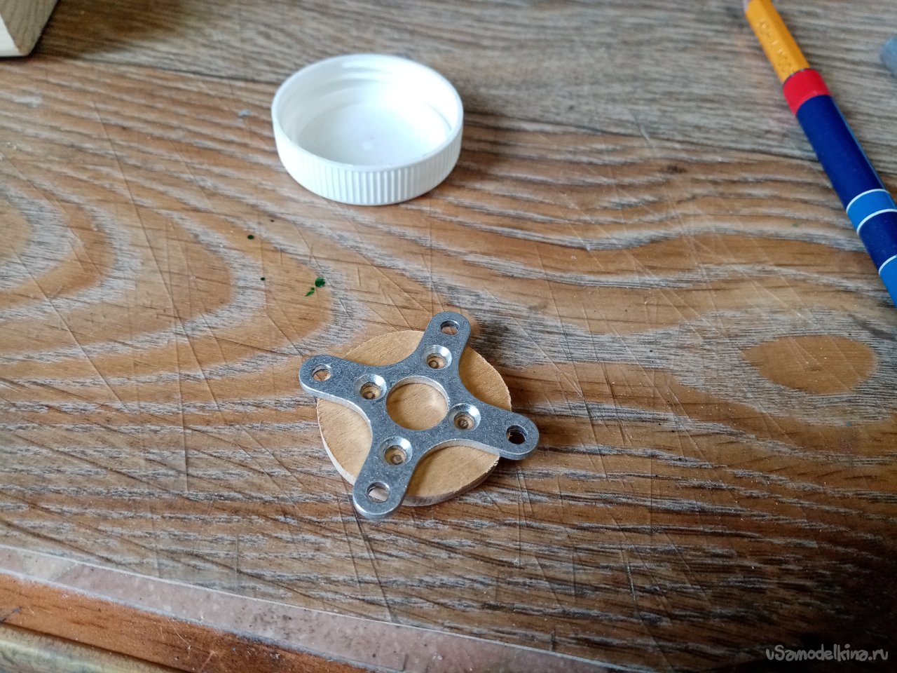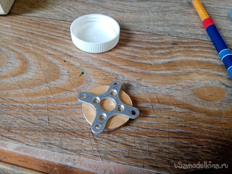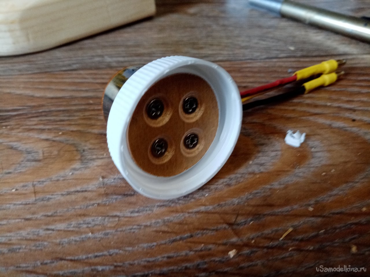 Срезаю заготовку с бакулки. На крышку прикручиваю двигатель с обратной стороны.