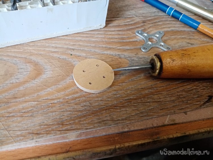 Болтики крепления двигателя слишком короткие, учитывая толщину фанеры. Пошарил по углам. Не нашел нужной длины. Есть варианты, отрезать от длинных болтиков нужной длины и зенковать отверстия в фанере. Второй вариант проще. Зенковкой прогрыз воронки нужного размера.