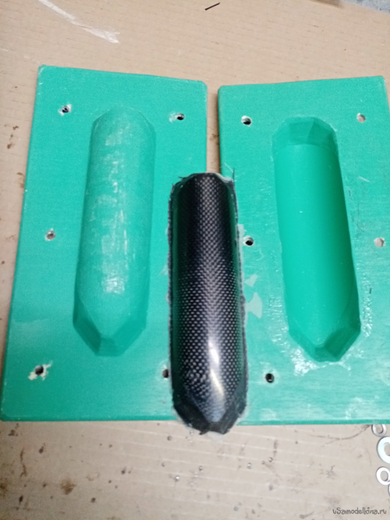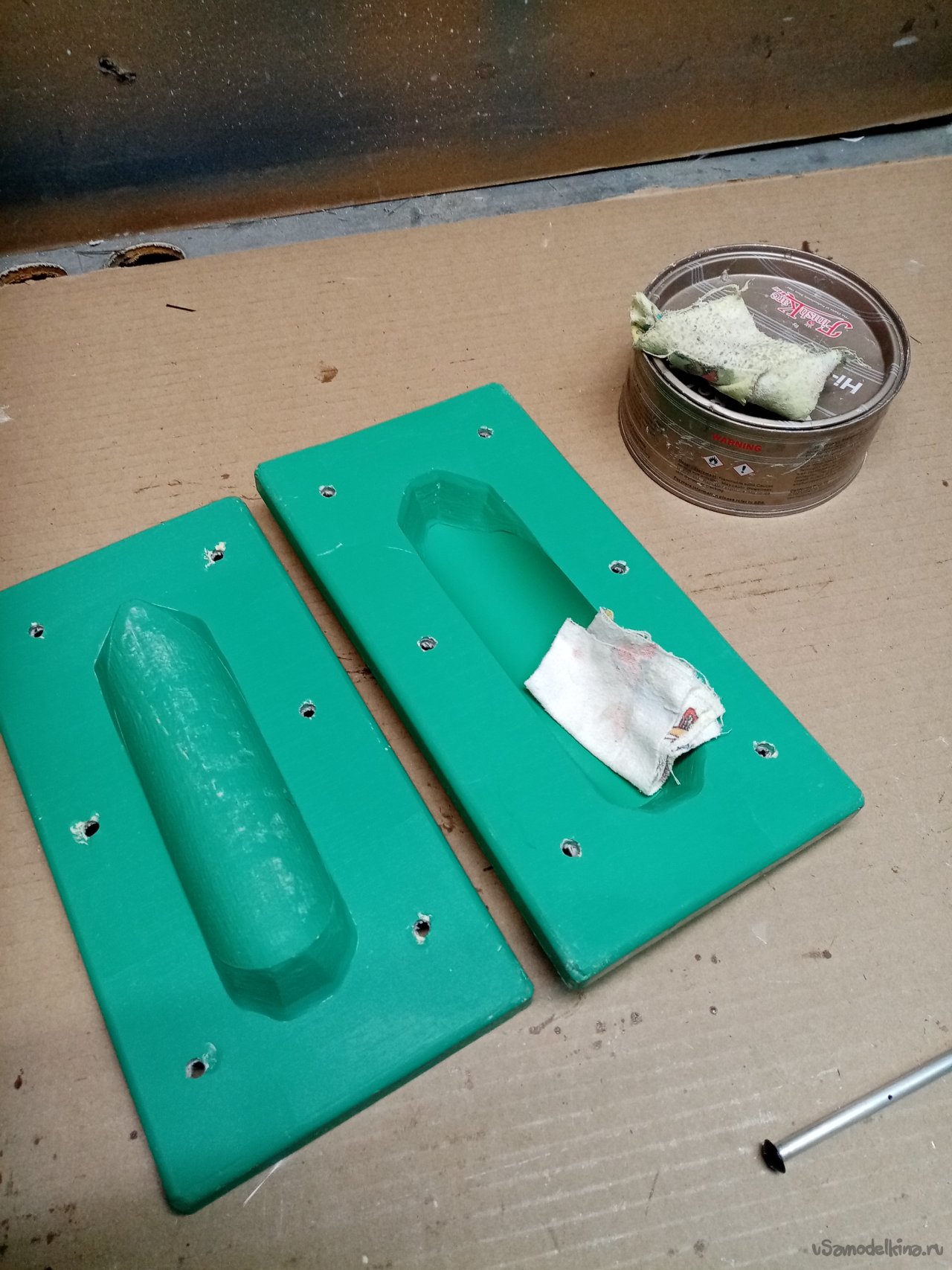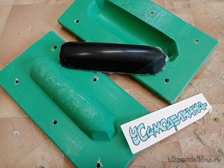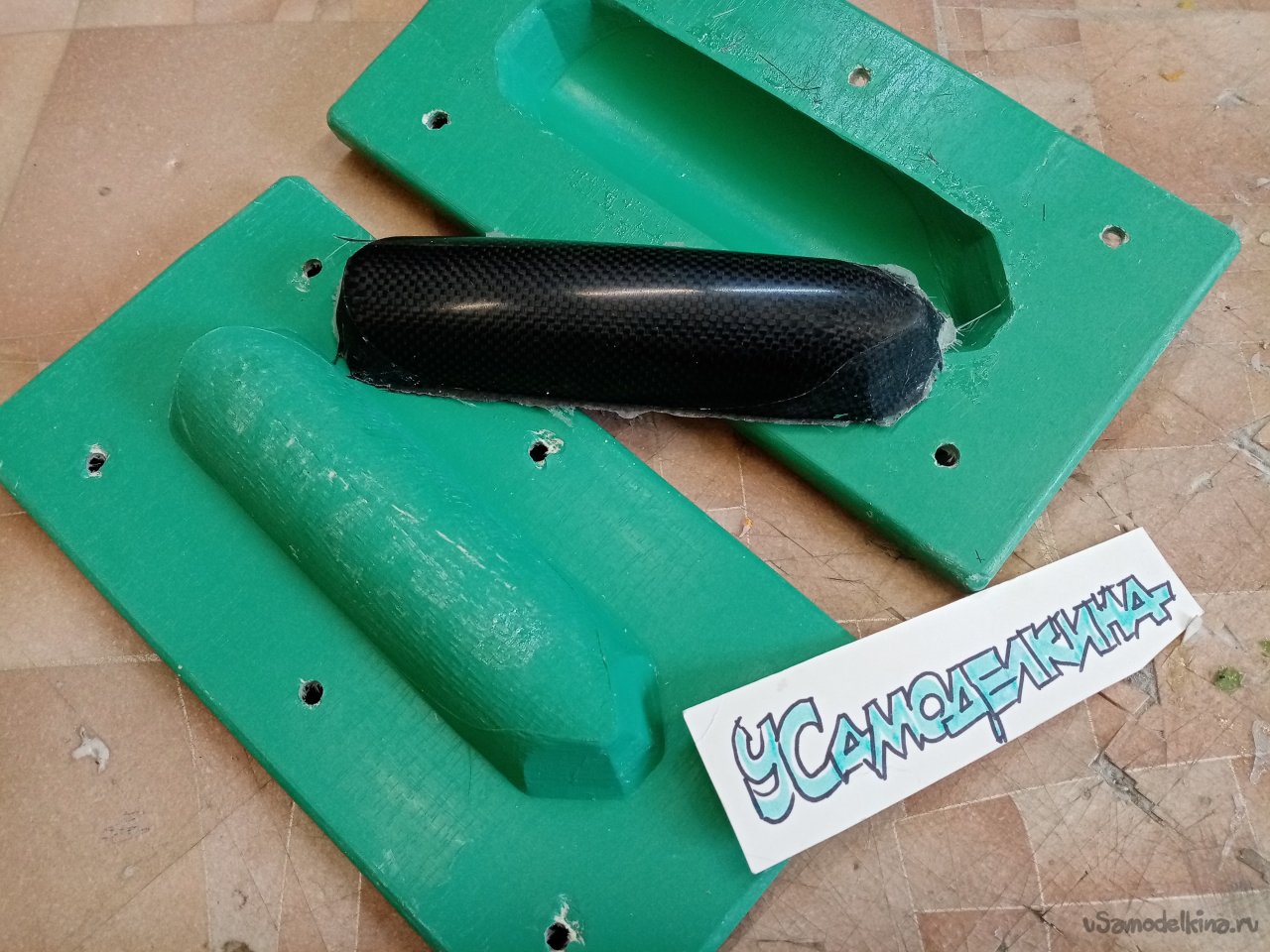 Все прошло отлично. Поверхность крышки ровная и блестящая. Можно переходить к основному блюду. Освобождаю поверхность половинок матрицы от остатков эпоксидной смолы. Наношу ваксу в два слоя с располировкой. Заготовки нарезаны. Взвешиваю материал. И замешиваю такое-же количество смолы. Процедура следующая. Наношу смолу кисточкой на половинку матрицы. Укладываю карбон, расправляю и пропитываю смолой. Поскольку ткань не мгновенно пропитывается нужно некоторое время. Затем укладываю слой стеклорогожи и пропитываю остатками смолы. Все действия провожу щетинистой кисточкой.