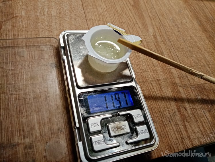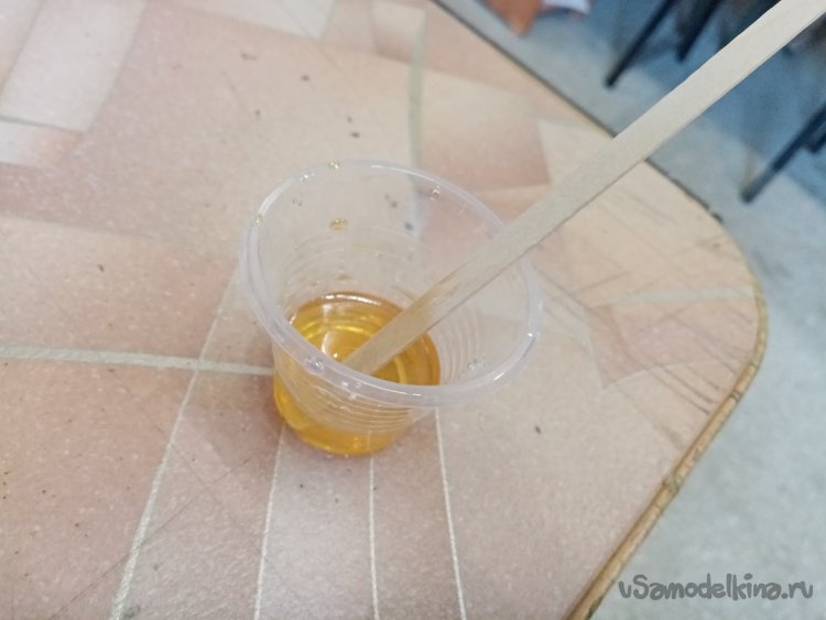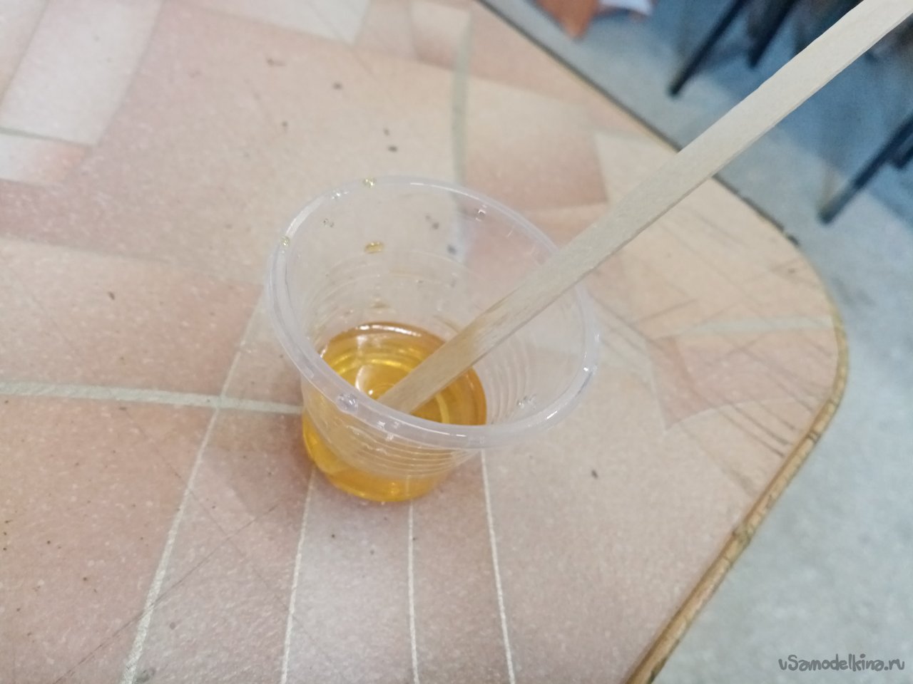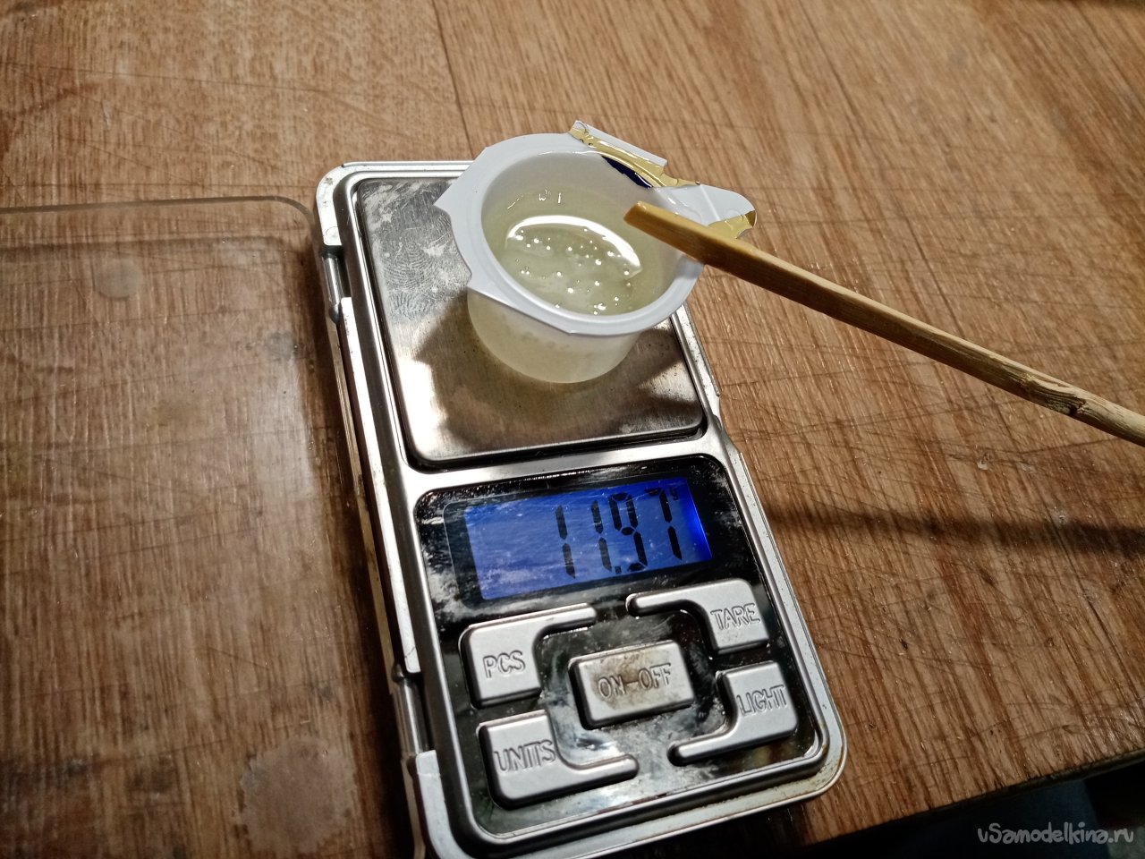 В работе буду применять эпоксидную смолу 128. Осталось немного от прежних запасов. Перед работой проверяю соотношение смолы и отвердителя на небольших замесах. В хранении смолы есть тонкость. При длительном хранении она набирает воду из воздуха. И соотношение отвердителя немного меняется. После нескольких замесов подобрал пропорцию. Получилось не один к восьми, а один к десяти. Проверка закончена. Можно работать.