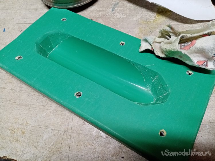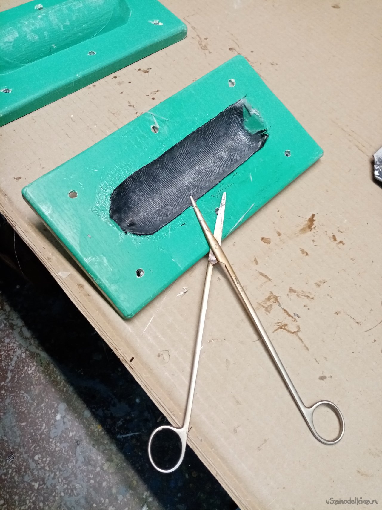После укладки и пропитки стеклоткани и карбона обрезаю неровности по краям формы. Для этой цели использую кривые медицинские ножницы. Поскольку прямыми ножницами подлезть точно в край не удается.