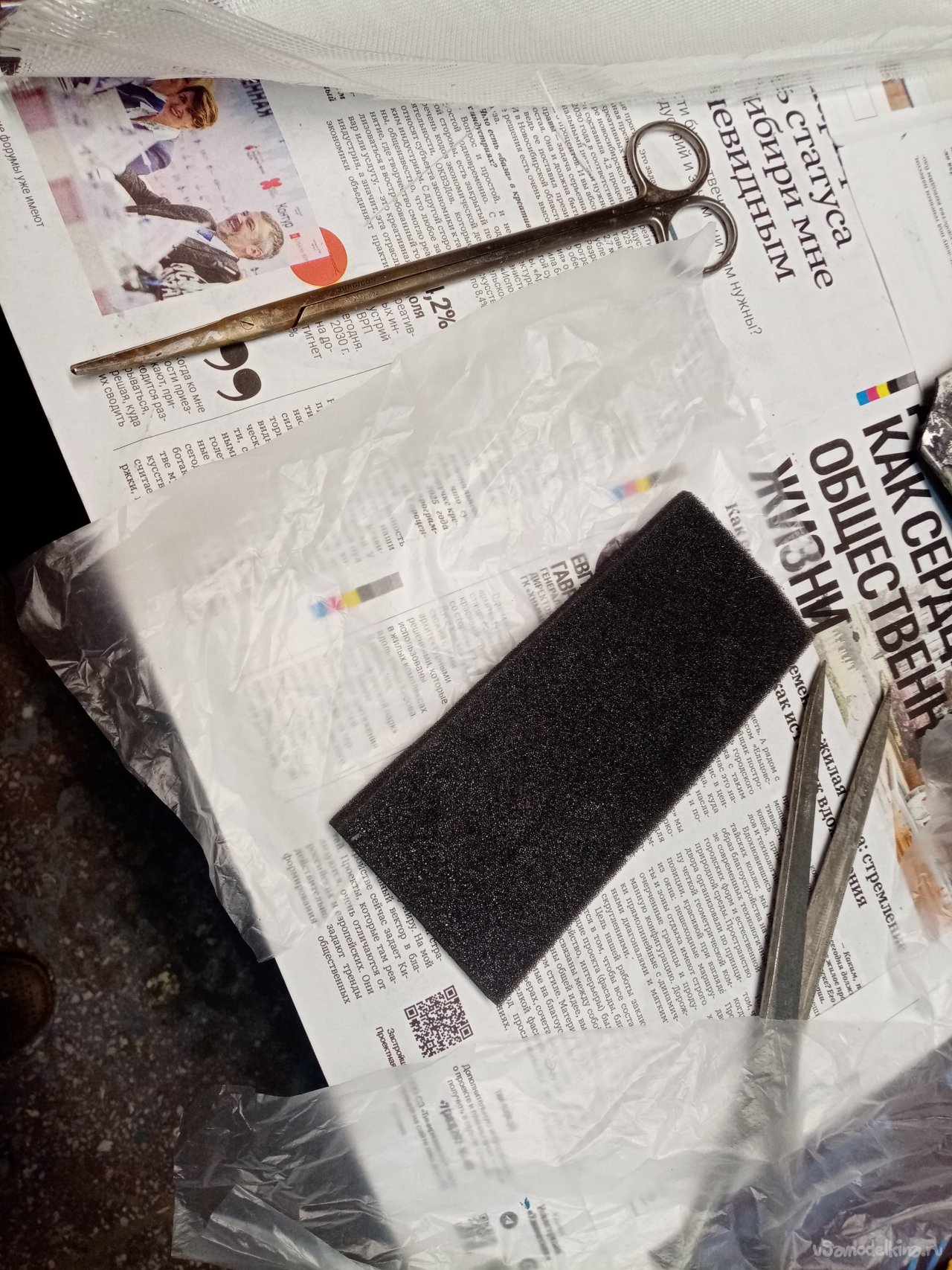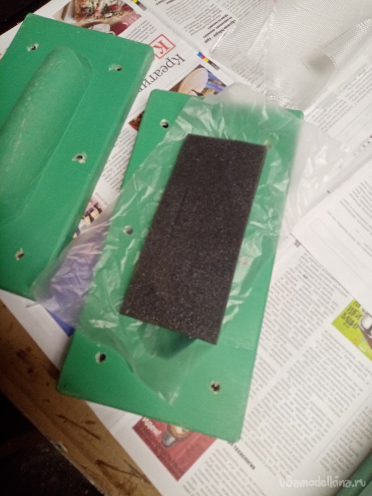 В форму нужно уложить прокладку для большего прижима этого бутерброда. Поскольку в первом образце не очень хорошо продавился внутренний слой. Погрешность понятна. Форма получилась не жесткая и при затягивании болтами по краю прогибается. Но нет лишней смолы и ткани нарастить слой. Хотя оставил бортики. И можно в дальнейшем усилить матрицу. Вырезаю кусочек поролона, он будет прижимать все внутри. Чтобы не прилип на эпоксидную основу, укладываю тонкую пленку и сверху кусочек поролона. Закрываю форму и затягиваю винты.